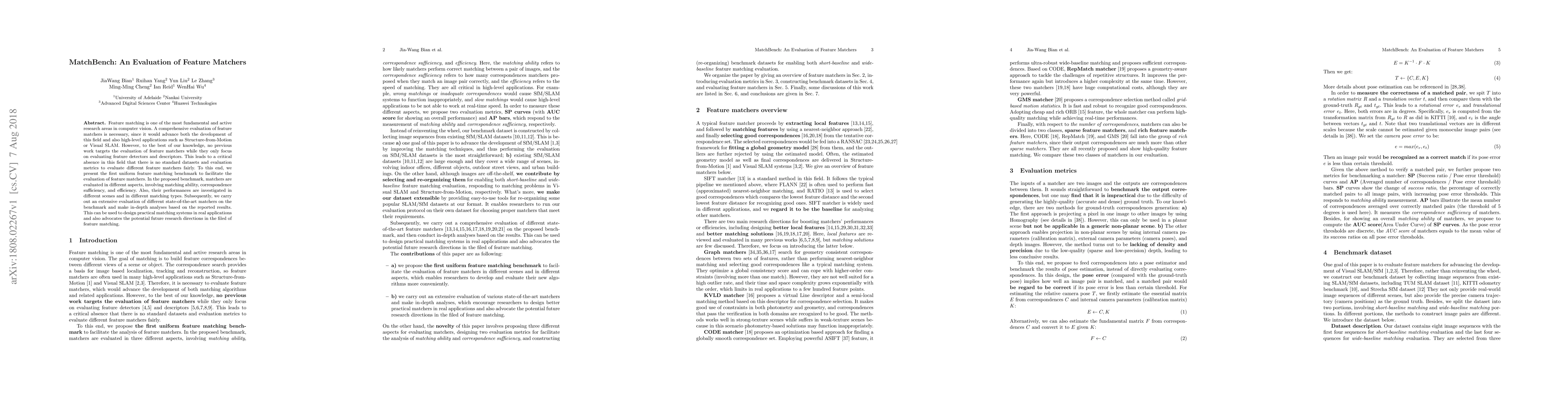 The paper introduces MatchBench, the first comprehensive benchmark for evaluating feature matchers in computer vision, addressing the lack of standard datasets and metrics. It assesses matchers based on matching ability, correspondence sufficiency, and efficiency across various scenes and matching types, providing insights for future research and practical applications.