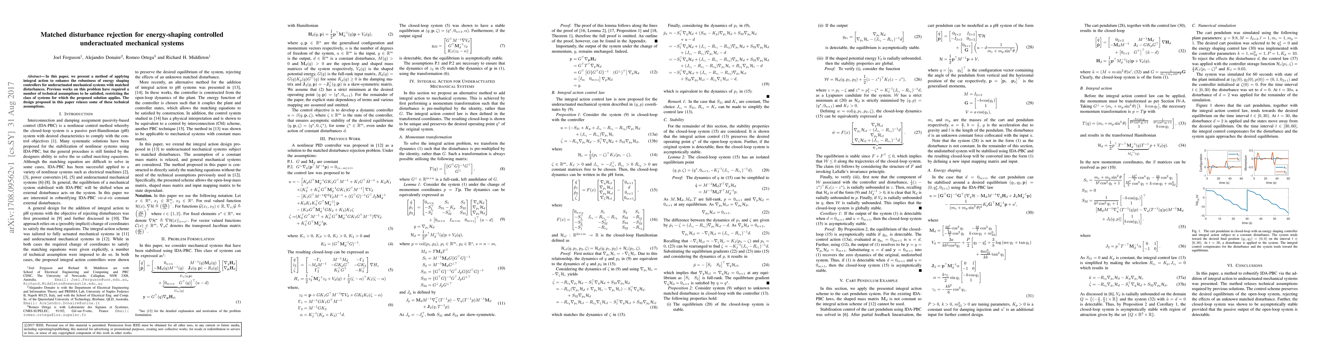 In this paper, we present a method of applying integral action to enhance the robustness of energy shaping controllers for underactuated mechanical systems with matched disturbances. Previous works on this problem have required a number of technical assumptions to be satisfied, restricting the class of systems for which the proposed solution applies. The design proposed in this paper relaxes some of these technical assumptions.