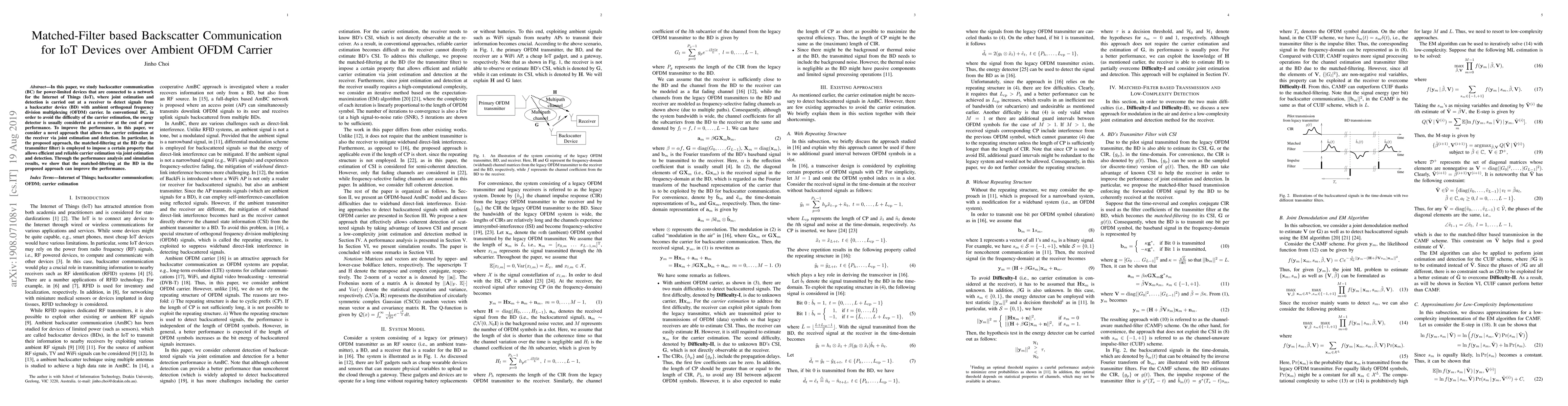 In this paper, we study backscatter communication (BC) for power-limited devices that are connected to a network for the Internet of Things (IoT), where joint estimation and detection is carried out at a receiver to detect signals from a backscatter device (BD) with ambient orthogonal frequency division multiplexing (OFDM) carrier. In conventional BC, in order to avoid the difficulty of the carrier estimation, the energy detector is usually considered at a receiver at the cost of poor performance. To improve the performance, in this paper, we consider a novel approach that allows the carrier estimation at the receiver via joint estimation and detection. In particular, in the proposed approach, the matched-filtering at the BD (for the transmitter filter) is employed to impose a certain property that allows efficient and reliable carrier estimation via joint estimation and detection. Through the performance analysis and simulation results, we show that the matched-filtering at the BD in the proposed approach can improve the performance.