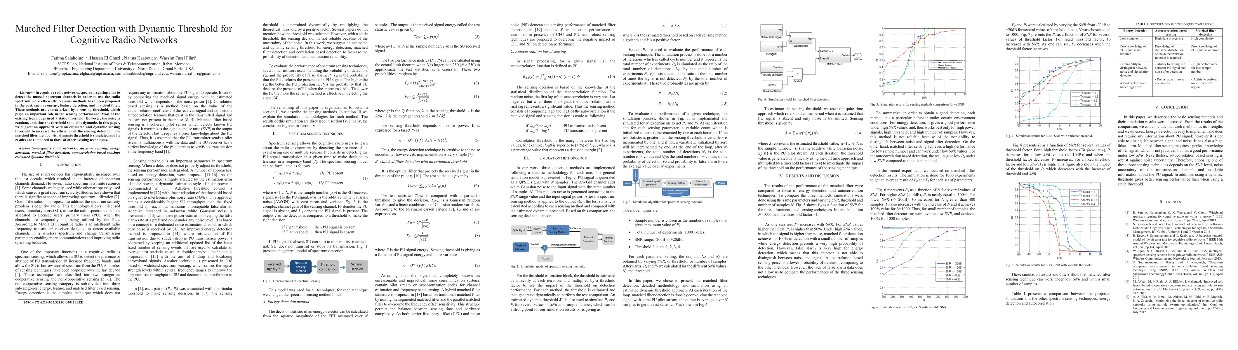-In cognitive radio networks, spectrum sensing aims to detect the unused spectrum channels in order to use the radio spectrum more efficiently. Various methods have been proposed in the past, such as energy, feature detection, and matched filter. These methods are characterized by a sensing threshold, which plays an important role in the sensing performance. Most of the existing techniques used a static threshold. However, the noise is random, and, thus the threshold should be dynamic. In this paper, we suggest an approach with an estimated and dynamic sensing threshold to increase the efficiency of the sensing detection. The matched filter method with dynamic threshold is simulated and its results are compared to those of other existing techniques. Keywords-cognitive radio networks; spectrum sensing; energy detection; matched filter detection; autocorrelation based sensing; estimated dynamic threshold