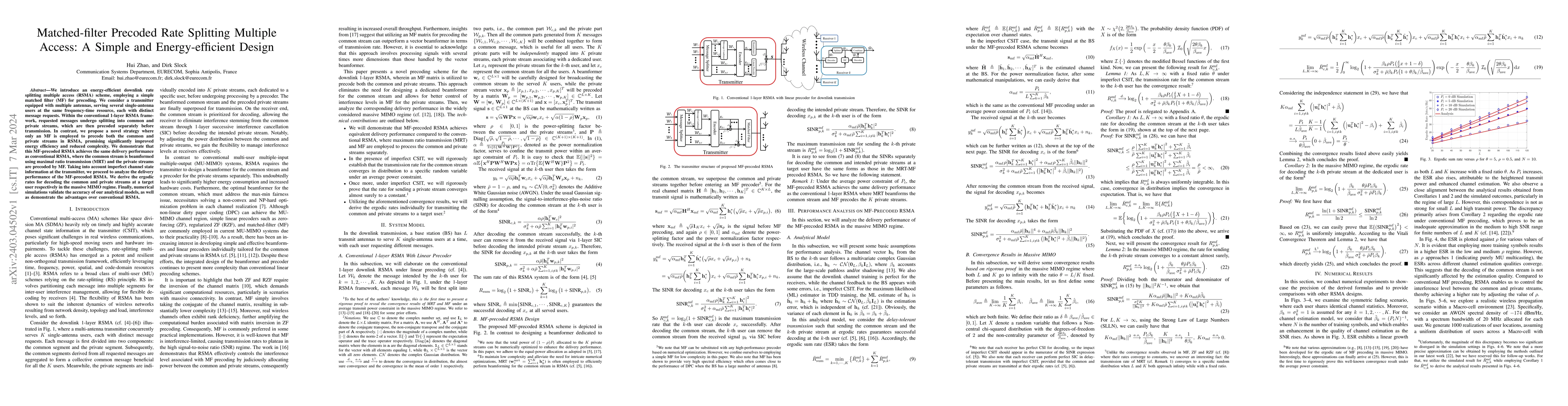 We introduce an energy-efficient downlink rate splitting multiple access (RSMA) scheme, employing a simple matched filter (MF) for precoding. We consider a transmitter equipped with multiple antennas, serving several single-antenna users at the same frequency-time resource, each with distinct message requests. Within the conventional 1-layer RSMA framework, requested messages undergo splitting into common and private streams, which are then precoded separately before transmission. In contrast, we propose a novel strategy where only an MF is employed to precode both the common and private streams in RSMA, promising significantly improved energy efficiency and reduced complexity. We demonstrate that this MF-precoded RSMA achieves the same delivery performance as conventional RSMA, where the common stream is beamformed using maximal ratio transmission (MRT) and the private streams are precoded by MF. Taking into account imperfect channel state information at the transmitter, we proceed to analyze the delivery performance of the MF-precoded RSMA. We derive the ergodic rates for decoding the common and private streams at a target user respectively in the massive MIMO regime. Finally, numerical simulations validate the accuracy of our analytical models, as well as demonstrate the advantages over conventional RSMA.