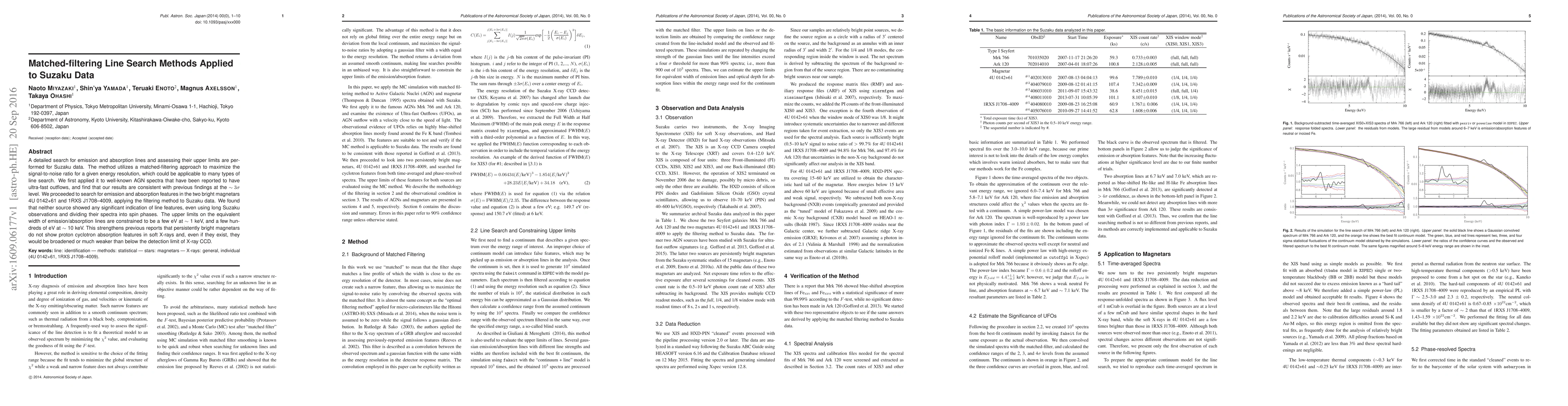 A detailed search for emission and absorption lines and assessing their upper limits are performed for Suzaku data. The method utilizes a matched-filtering approach to maximize the signal-to-noise ratio for a given energy resolution, which could be applicable to many types of line search. We first applied it to well-known AGN spectra that have been reported to have ultra-fast outflows, and find that our results are consistent with previous findings at the ~3{\sigma} level. We proceeded to search for emission and absorption features in the two bright magnetars 4U 0142+61 and 1RXS J1708-4009, applying the filtering method to Suzaku data. We found that neither source showed any significant indication of line features, even using long Suzaku observations and dividing their spectra into spin phases. The upper limits on the equivalent width of emission/absorption lines are constrained to be a few eV at ~1 keV, and a few hundreds of eV at ~10 keV. This strengthens previous reports that persistently bright magnetars do not show proton cyclotron absorption features in soft X-rays and, even if they exist, they would be broadened or much weaker than below the detection limit of X-ray CCD.