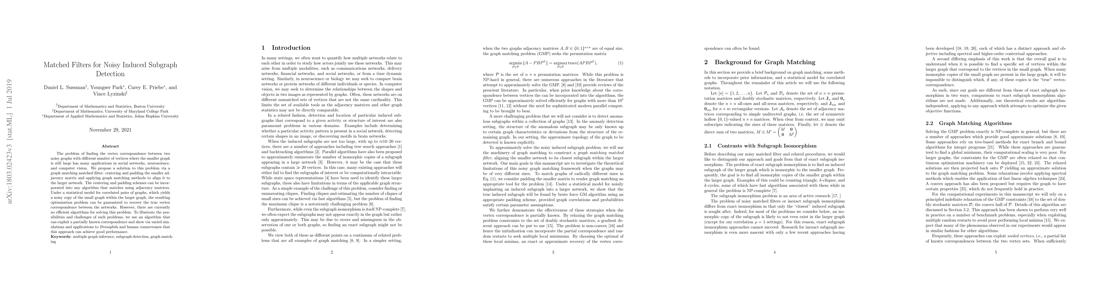 The problem of finding the vertex correspondence between two noisy graphs with different number of vertices where the smaller graph is still large has many applications in social networks, neuroscience, and computer vision. We propose a solution to this problem via a graph matching matched filter: centering and padding the smaller adjacency matrix and applying graph matching methods to align it to the larger network. The centering and padding schemes can be incorporated into any algorithm that matches using adjacency matrices. Under a statistical model for correlated pairs of graphs, which yields a noisy copy of the small graph within the larger graph, the resulting optimization problem can be guaranteed to recover the true vertex correspondence between the networks. However, there are currently no efficient algorithms for solving this problem. To illustrate the possibilities and challenges of such problems, we use an algorithm that can exploit a partially known correspondence and show via varied simulations and applications to {\it Drosophila} and human connectomes that this approach can achieve good performance.