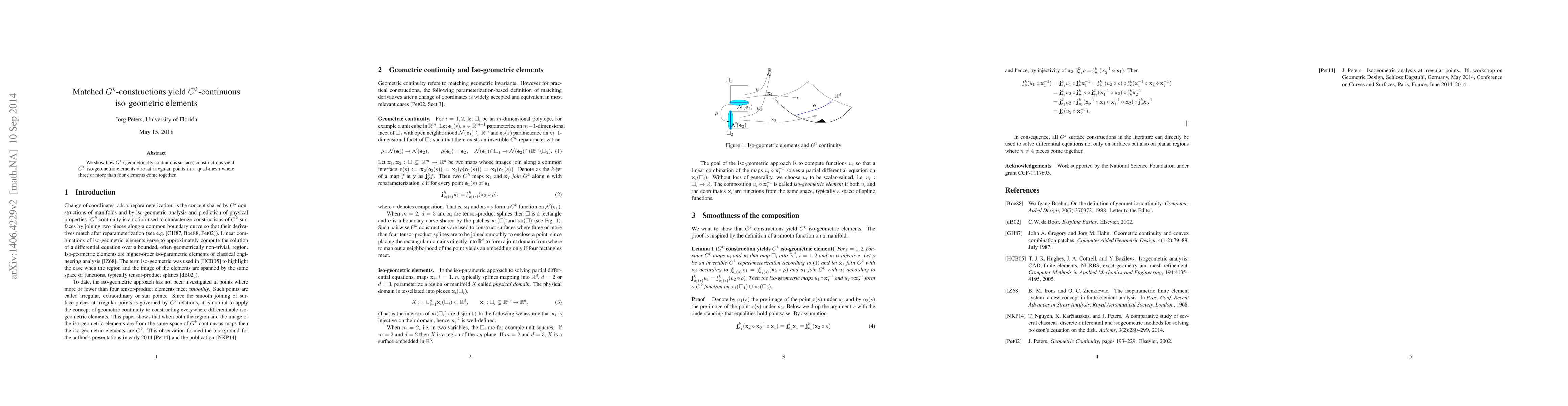 The note shows how $G^k$ (geometrically continuous surface) constructions yield $C^k$ iso-geometric elements also at irregular quad mesh points where three or more than four elements come together.