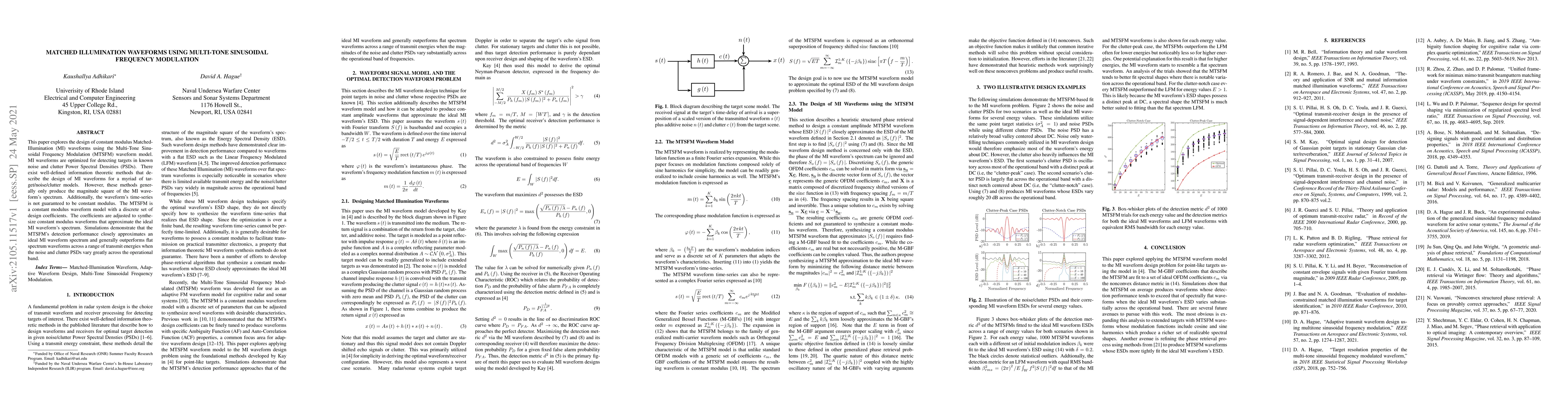 This paper explores the design of constant modulus Matched-Illumination (MI) waveforms using the Multi-Tone Sinusoidal Frequency Modulation (MTSFM) waveform model. MI waveforms are optimized for detecting targets in known noise and clutter Power Spectral Densities (PSDs). There exist well-defined information theoretic methods that describe the design of MI waveforms for a myriad of target/noise/clutter models. However, these methods generally only produce the magnitude square of the MI waveform's spectrum. Additionally, the waveform's time-series is not guaranteed to be constant modulus. The MTSFM is a constant modulus waveform model with a discrete set of design coefficients. The coefficients are adjusted to synthesize constant modulus waveforms that approximate the ideal MI waveform's spectrum. Simulations demonstrate that the MTSFM's detection performance closely approximates an ideal MI waveform spectrum and generally outperforms flat spectrum waveforms across a range of transmit energies when the noise and clutter PSDs vary greatly across the operational band.