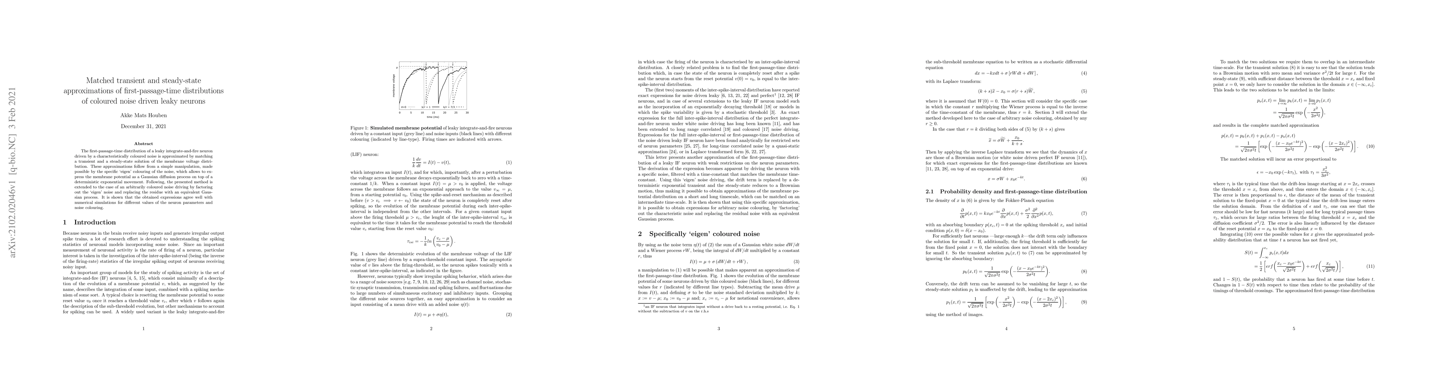 This paper develops matched transient and steady-state approximations for the first-passage-time distribution of leaky neurons driven by coloured noise, showing that these approximations align well with numerical simulations across various neuron parameters and noise characteristics. The method leverages the specific 'eigen' colouring of the noise to simplify the analysis.