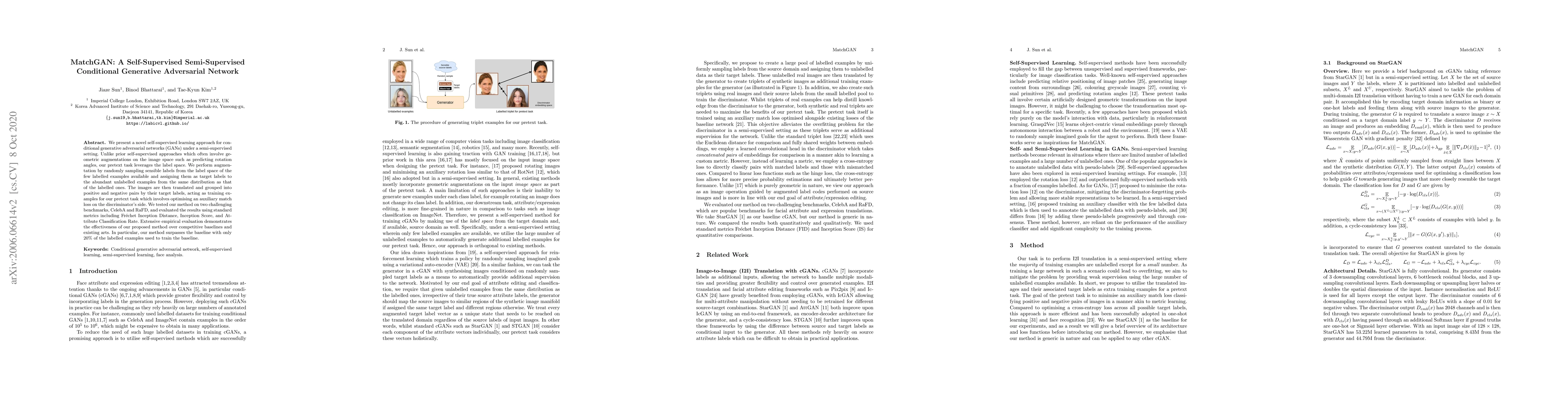 MatchGAN introduces a triplet matching objective as a pretext task, utilizing both labeled and synthetic examples for training, and demonstrating improved performance on face attribute manipulation tasks.