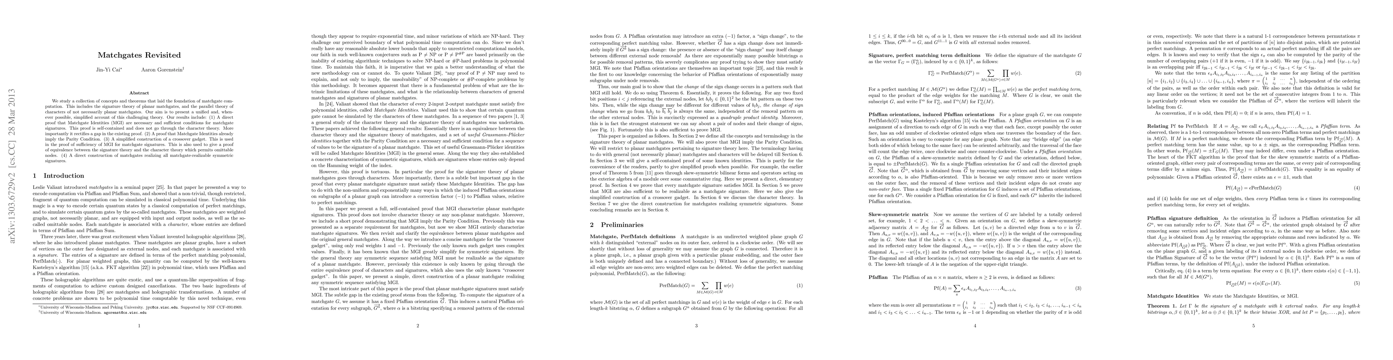 We study a collection of concepts and theorems that laid the foundation of matchgate computation. This includes the signature theory of planar matchgates, and the parallel theory of characters of not necessarily planar matchgates. Our aim is to present a unified and, whenever possible, simplified account of this challenging theory. Our results include: (1) A direct proof that Matchgate Identities (MGI) are necessary and sufficient conditions for matchgate signatures. This proof is self-contained and does not go through the character theory. More importantly it rectifies a gap in the existing proof. (2) A proof that Matchgate Identities already imply the Parity Condition. (3) A simplified construction of a crossover gadget. This is used in the proof of sufficiency of MGI for matchgate signatures. This is also used to give a proof of equivalence between the signature theory and the character theory which permits omittable nodes. (4) A direct construction of matchgates realizing all matchgate-realizable symmetric signatures.