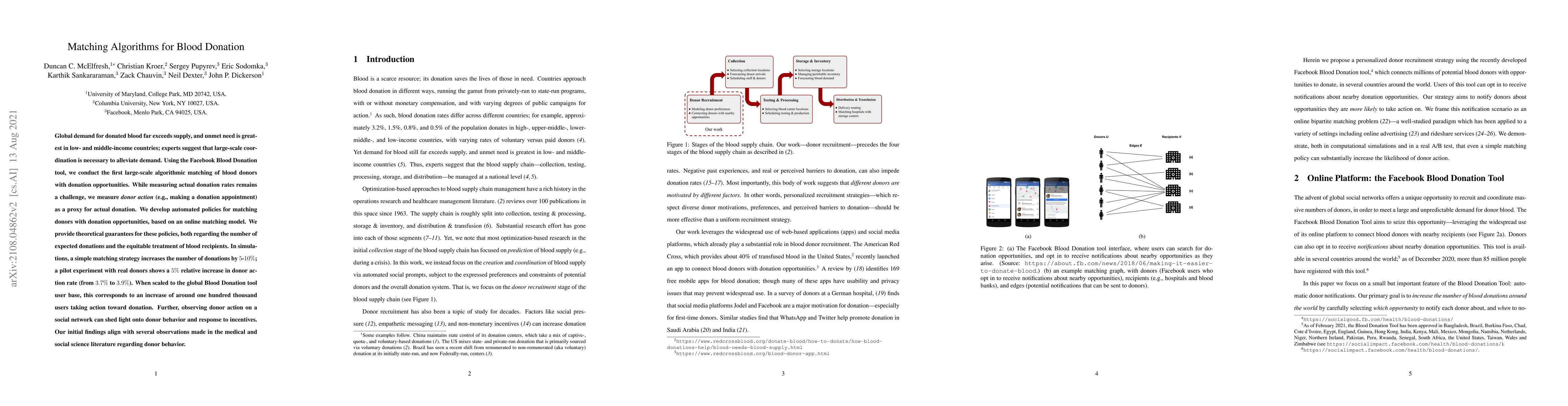 A large-scale algorithmic matching system for blood donors increased donor action rates by 5% in a pilot experiment, corresponding to around one hundred thousand users taking action towards donation.