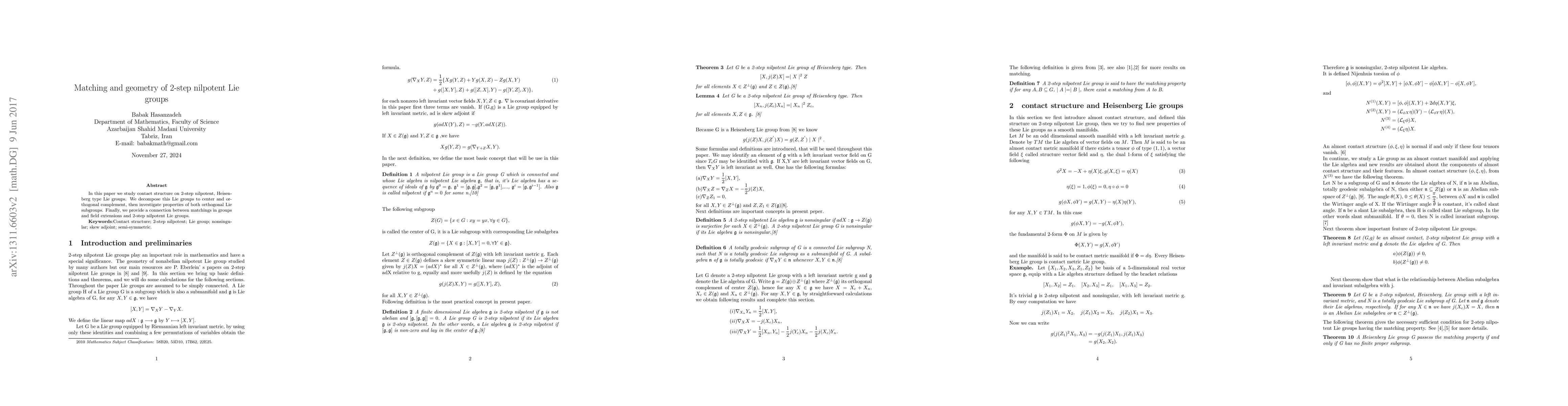 This paper examines the contact structure on 2-step nilpotent Heisenberg Lie groups, decomposes them into center and orthogonal complement, and investigates the properties of these subgroups. It also establishes a link between matchings in groups and field extensions in relation to 2-step nilpotent Lie groups.