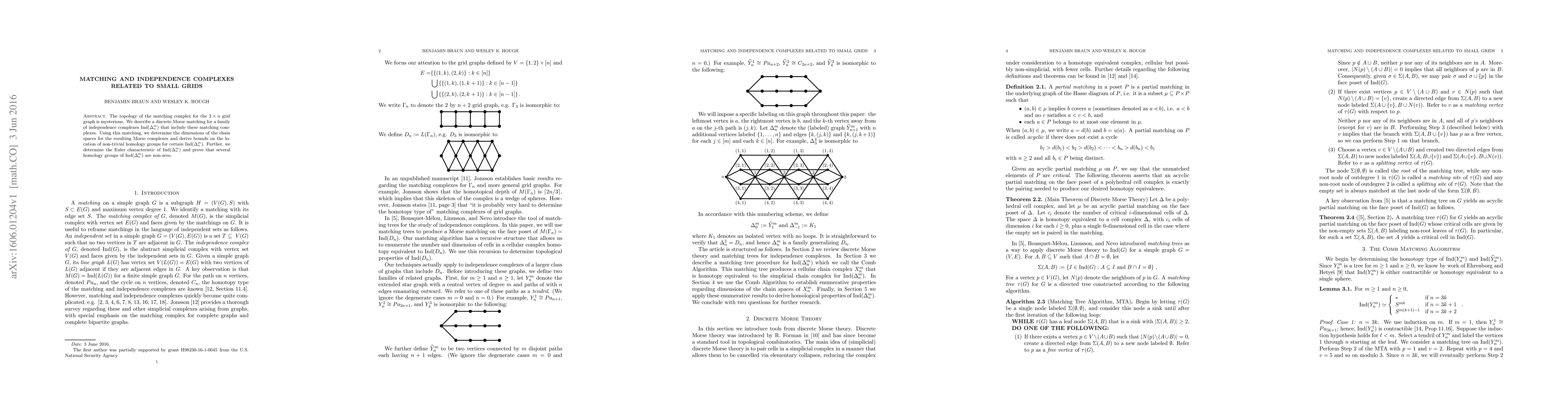 This paper explores the topology of matching complexes in $2\times n$ grid graphs through discrete Morse theory applied to independence complexes $\mathrm{Ind}(\Delta_n^m)$. It determines dimensions of chain spaces, establishes bounds on non-trivial homology, and proves the Euler characteristic and non-zero status of several homology groups.