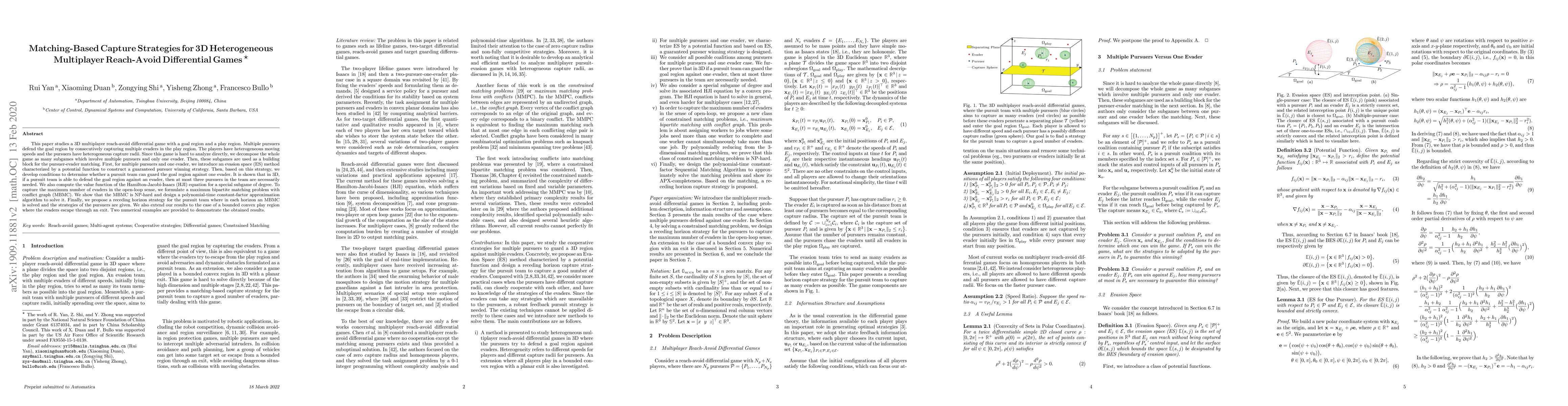 This paper studies a 3D multiplayer reach-avoid differential game with a goal region and a play region. Multiple pursuers defend the goal region by consecutively capturing multiple evaders in the play region. The players have heterogeneous moving speeds and the pursuers have heterogeneous capture radii. Since this game is hard to analyze directly, we decompose the whole game as many subgames which involve multiple pursuers and only one evader. Then, these subgames are used as a building block for the pursuer-evader matching. First, for multiple pursuers and one evader, we introduce an evasion space (ES) method characterized by a potential function to construct a guaranteed pursuer winning strategy. Then, based on this strategy, we develop conditions to determine whether a pursuit team can guard the goal region against one evader. It is shown that in 3D, if a pursuit team is able to defend the goal region against an evader, then at most three pursuers in the team are necessarily needed. We also compute the value function of the Hamilton-Jacobi-Isaacs (HJI) equation for a special subgame of degree. To capture the maximum number of evaders in the open-loop sense, we formulate a maximum bipartite matching problem with conflict graph (MBMC). We show that the MBMC is NP-hard and design a polynomial-time constant-factor approximation algorithm to solve it. Finally, we propose a receding horizon strategy for the pursuit team where in each horizon an MBMC is solved and the strategies of the pursuers are given. We also extend our results to the case of a bounded convex play region where the evaders escape through an exit. Two numerical examples are provided to demonstrate the obtained results.