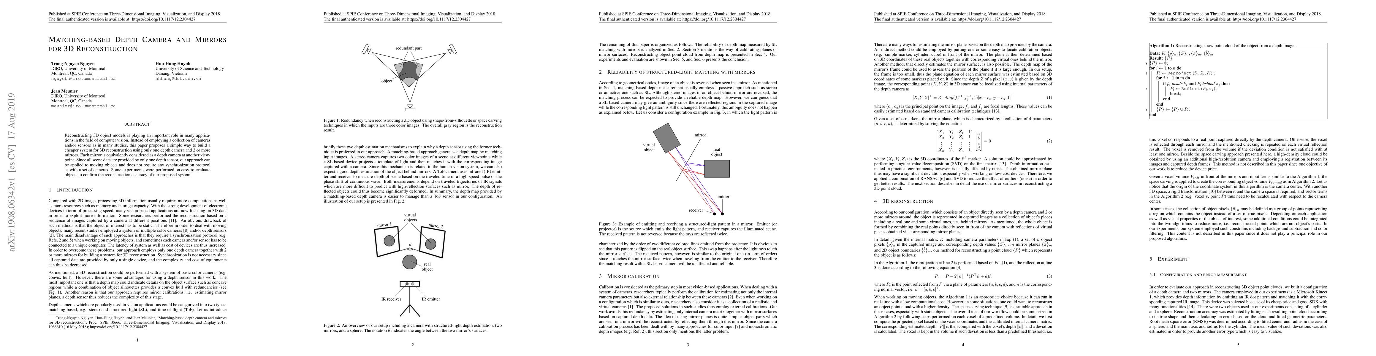 Reconstructing 3D object models is playing an important role in many applications in the field of computer vision. Instead of employing a collection of cameras and/or sensors as in many studies, this paper proposes a simple way to build a cheaper system for 3D reconstruction using only one depth camera and 2 or more mirrors. Each mirror is equivalently considered as a depth camera at another viewpoint. Since all scene data are provided by only one depth sensor, our approach can be applied to moving objects and does not require any synchronization protocol as with a set of cameras. Some experiments were performed on easy-to-evaluate objects to confirm the reconstruction accuracy of our proposed system.