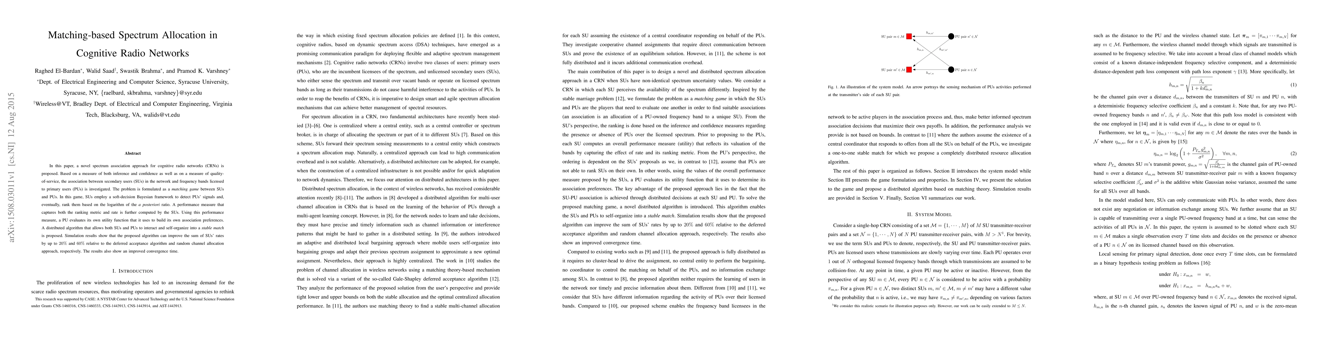 This paper proposes a novel spectrum association approach for cognitive radio networks using a matching game framework. The algorithm enhances secondary users' rates by up to 60% compared to random allocation, with improved convergence time, through a distributed interaction mechanism.