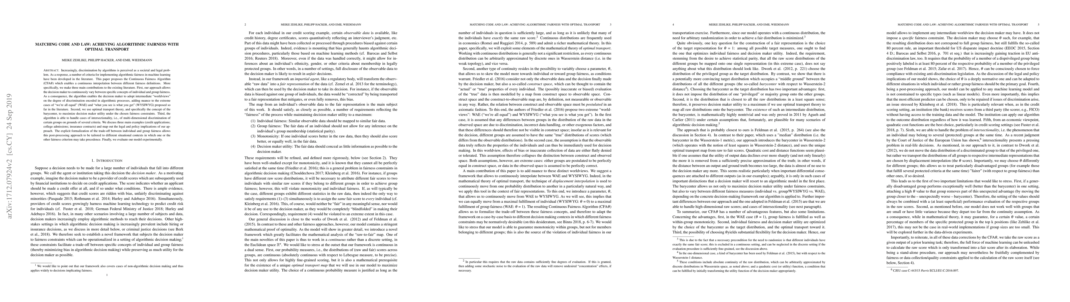 Increasingly, discrimination by algorithms is perceived as a societal and legal problem. As a response, a number of criteria for implementing algorithmic fairness in machine learning have been developed in the literature. This paper proposes the Continuous Fairness Algorithm (CFA$\theta$) which enables a continuous interpolation between different fairness definitions. More specifically, we make three main contributions to the existing literature. First, our approach allows the decision maker to continuously vary between specific concepts of individual and group fairness. As a consequence, the algorithm enables the decision maker to adopt intermediate ``worldviews'' on the degree of discrimination encoded in algorithmic processes, adding nuance to the extreme cases of ``we're all equal'' (WAE) and ``what you see is what you get'' (WYSIWYG) proposed so far in the literature. Second, we use optimal transport theory, and specifically the concept of the barycenter, to maximize decision maker utility under the chosen fairness constraints. Third, the algorithm is able to handle cases of intersectionality, i.e., of multi-dimensional discrimination of certain groups on grounds of several criteria. We discuss three main examples (credit applications; college admissions; insurance contracts) and map out the legal and policy implications of our approach. The explicit formalization of the trade-off between individual and group fairness allows this post-processing approach to be tailored to different situational contexts in which one or the other fairness criterion may take precedence. Finally, we evaluate our model experimentally.