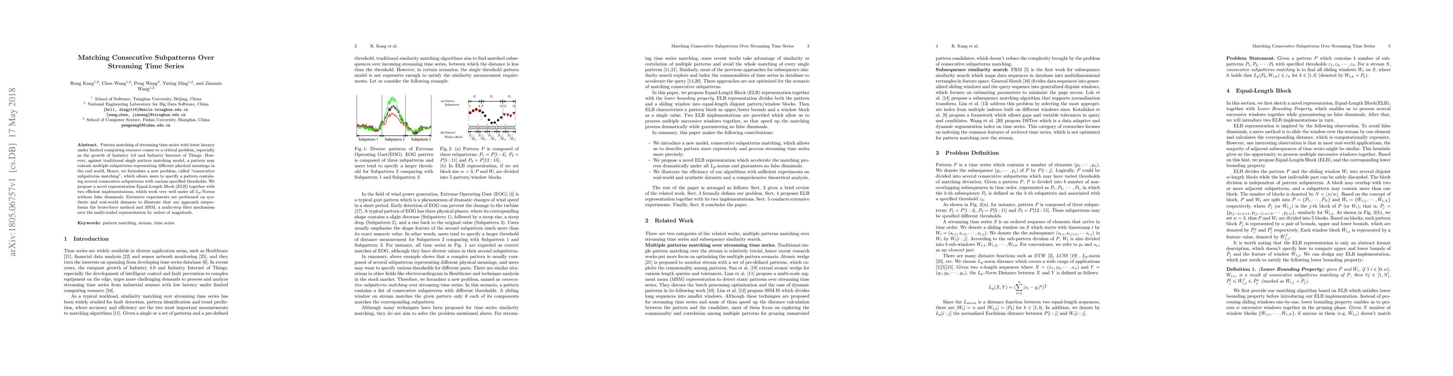 This paper introduces a new problem of "consecutive subpatterns matching" for streaming time series, proposing a novel Equal-Length Block (ELB) representation and two efficient implementations that outperform traditional methods under various Lp-Norms, significantly reducing latency and computational load. Experiments show substantial improvements over brute-force and MSM methods.