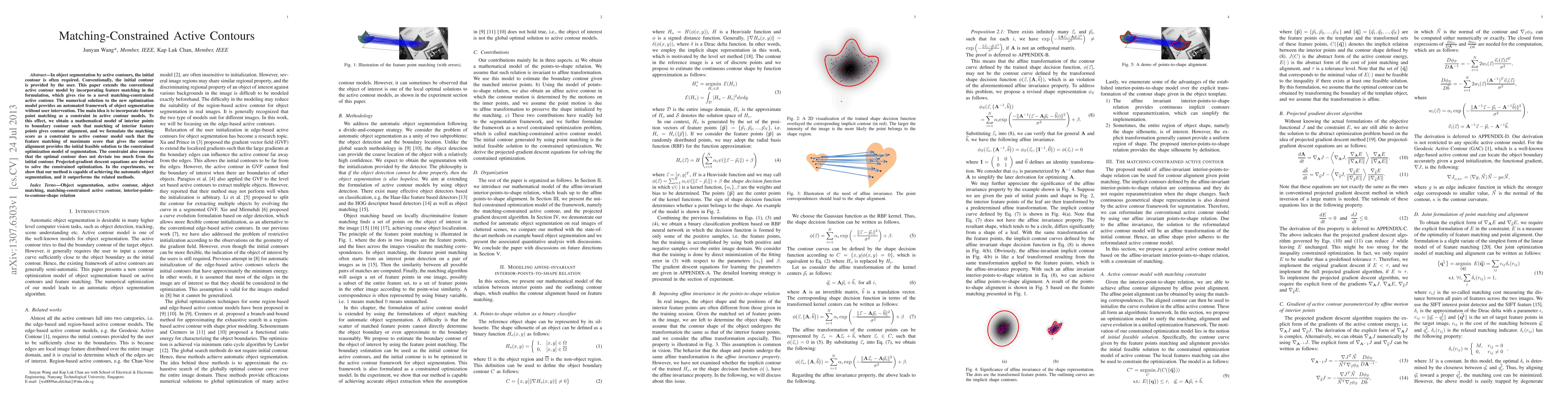This paper proposes a novel matching-constrained active contour model for automated object segmentation, incorporating feature point matching as a constraint to guide contour alignment. The method outperforms conventional methods by providing an initial feasible solution through feature matching, ensuring minimal deviation from the initial contour.