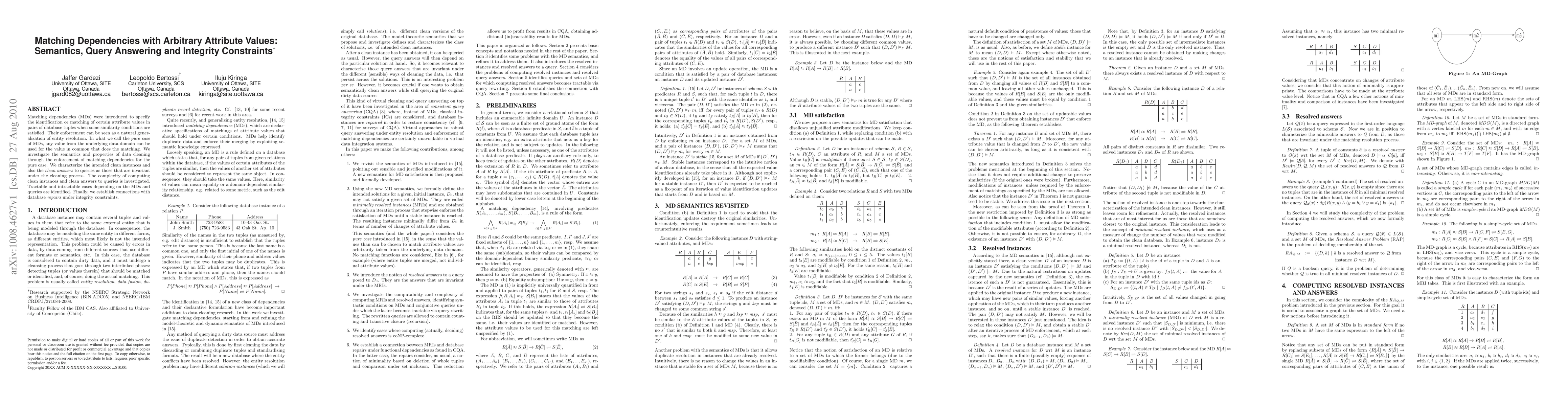 This paper explores the semantics and enforcement of matching dependencies (MDs) in databases, focusing on the "pure case" where any attribute value can be used for matching. It investigates the properties of data cleaning via MDs, characterizes clean instances and query answers, and analyzes the complexity of computing these clean states and answers. The study also connects MDs with database integrity constraints and repairs.
