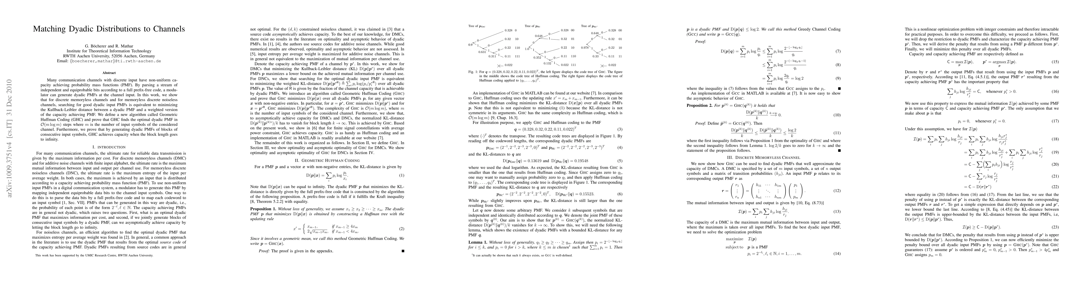 This paper proposes a new algorithm, Geometric Huffman Coding (GHC), to find optimal dyadic probability mass functions (PMFs) for discrete memoryless channels and noiseless channels. It demonstrates that minimizing the Kullback-Leibler distance between a dyadic PMF and the capacity achieving PMF is equivalent to searching for good dyadic inputs, and GHC achieves capacity as the block length of input symbols increases.