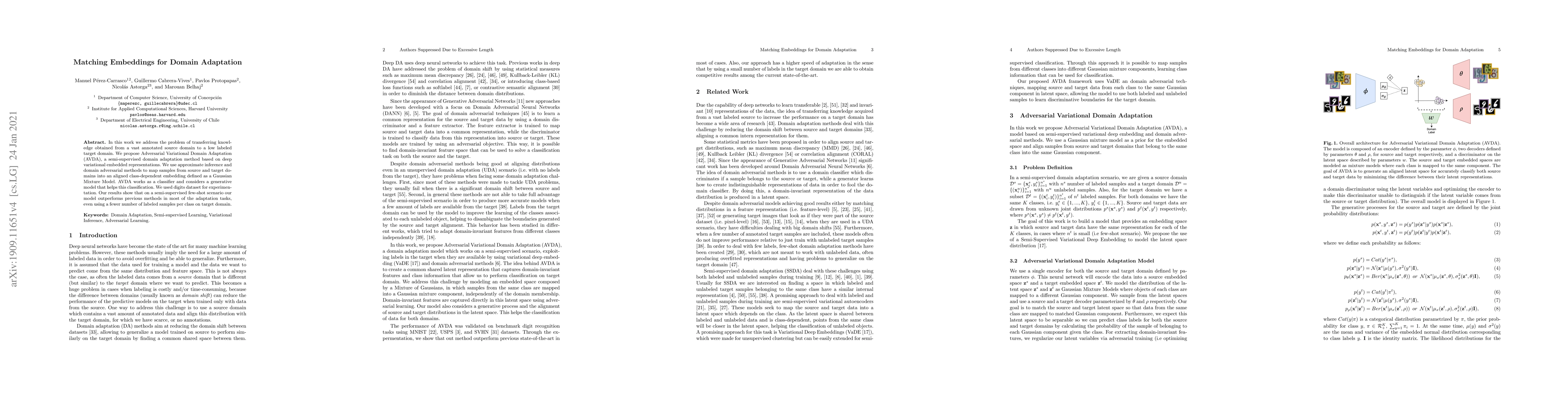 A new method called Adversarial Variational Domain Adaptation (AVDA) improves domain adaptation by matching embeddings between source and target domains, outperforming previous methods in semi-supervised few-shot scenarios.