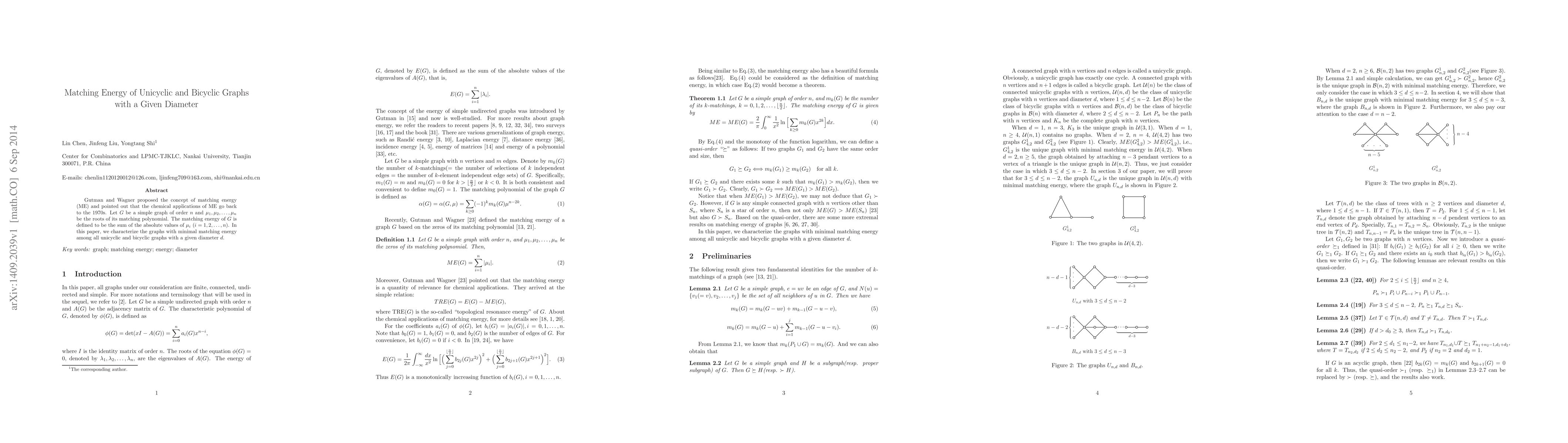 This paper explores the matching energy (ME) of unicyclic and bicyclic graphs, defining ME as the sum of the absolute values of the roots of the graph's matching polynomial, and identifies the graphs with minimal ME among those with a specified diameter $d$.