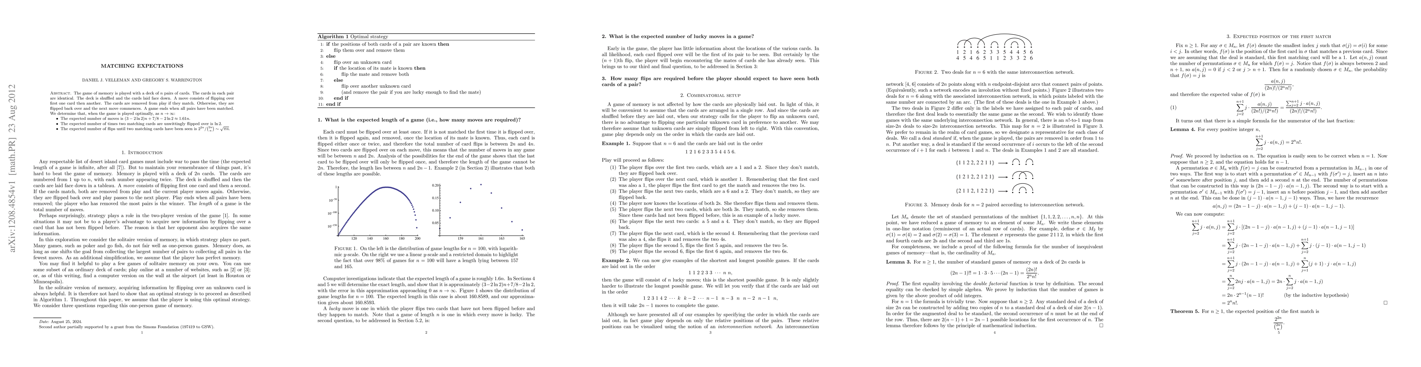 The game of memory is played with a deck of n pairs of cards. The cards in each pair are identical. The deck is shuffled and the cards laid face down. A move consists of flipping over first one card then another. The cards are removed from play if they match. Otherwise, they are flipped back over and the next move commences. A game ends when all pairs have been matched. We determine that, when the game is played optimally, as n tends to infinity: 1) The expected number of moves is (3 - 2 ln 2)n + 7/8 - 2 ln 2 (approximately 1.61 n), 2) The expected number of times two matching cards are unwittingly flipped over is ln 2, and 3) The expected number of flips until two matching cards have been seen is asymptotically sqrt{pi n}.