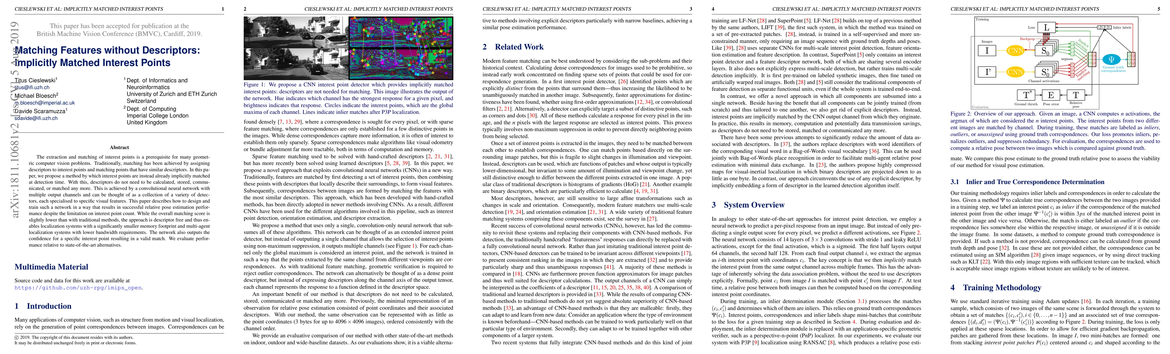The extraction and matching of interest points is a prerequisite for many geometric computer vision problems. Traditionally, matching has been achieved by assigning descriptors to interest points and matching points that have similar descriptors. In this paper, we propose a method by which interest points are instead already implicitly matched at detection time. With this, descriptors do not need to be calculated, stored, communicated, or matched any more. This is achieved by a convolutional neural network with multiple output channels and can be thought of as a collection of a variety of detectors, each specialized to specific visual features. This paper describes how to design and train such a network in a way that results in successful relative pose estimation performance despite the limitation on interest point count. While the overall matching score is slightly lower than with traditional methods, the approach is descriptor free and thus enables localization systems with a significantly smaller memory footprint and multi-agent localization systems with lower bandwidth requirements. The network also outputs the confidence for a specific interest point resulting in a valid match. We evaluate performance relative to state-of-the-art alternatives.