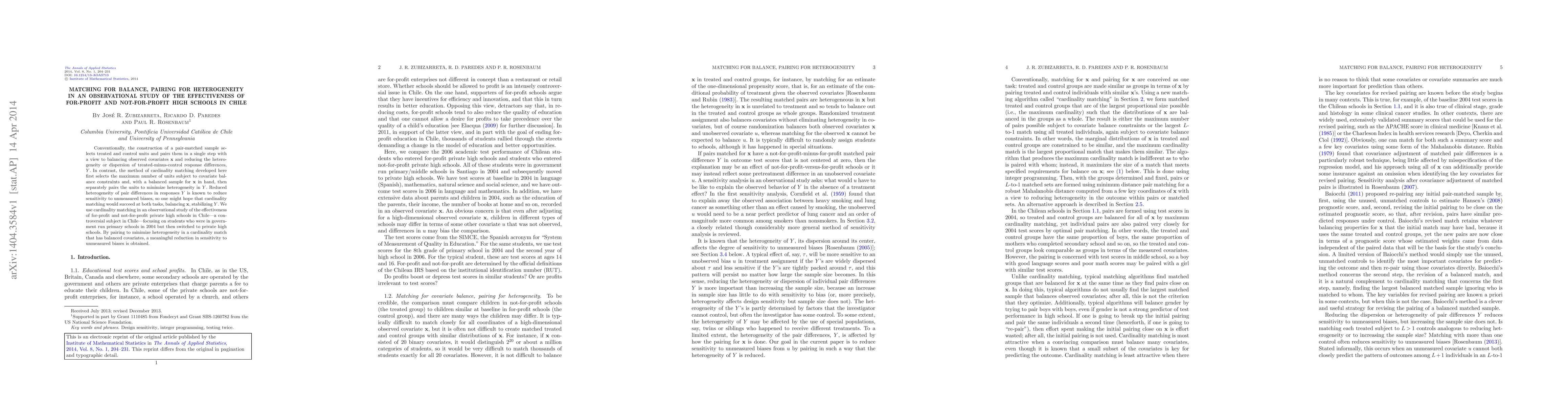 This paper introduces a novel matching method called cardinality matching to balance covariates and reduce heterogeneity in observational studies. It applies this method to compare the effectiveness of for-profit and not-for-profit high schools in Chile, achieving a reduction in sensitivity to unmeasured biases.