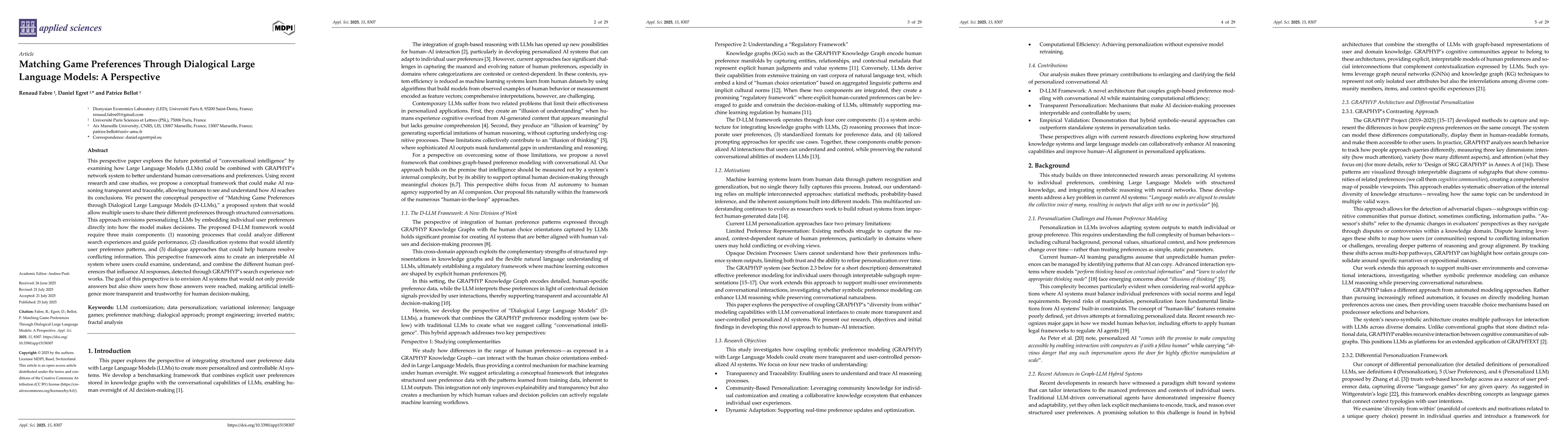 This perspective paper explores the future potential of "conversational intelligence" by examining how Large Language Models (LLMs) could be combined with GRAPHYP's network system to better understand human conversations and preferences. Using recent research and case studies, we propose a conceptual framework that could make AI rea-soning transparent and traceable, allowing humans to see and understand how AI reaches its conclusions. We present the conceptual perspective of "Matching Game Preferences through Dialogical Large Language Models (D-LLMs)," a proposed system that would allow multiple users to share their different preferences through structured conversations. This approach envisions personalizing LLMs by embedding individual user preferences directly into how the model makes decisions. The proposed D-LLM framework would require three main components: (1) reasoning processes that could analyze different search experiences and guide performance, (2) classification systems that would identify user preference patterns, and (3) dialogue approaches that could help humans resolve conflicting information. This perspective framework aims to create an interpretable AI system where users could examine, understand, and combine the different human preferences that influence AI responses, detected through GRAPHYP's search experience networks. The goal of this perspective is to envision AI systems that would not only provide answers but also show users how those answers were reached, making artificial intelligence more transparent and trustworthy for human decision-making.