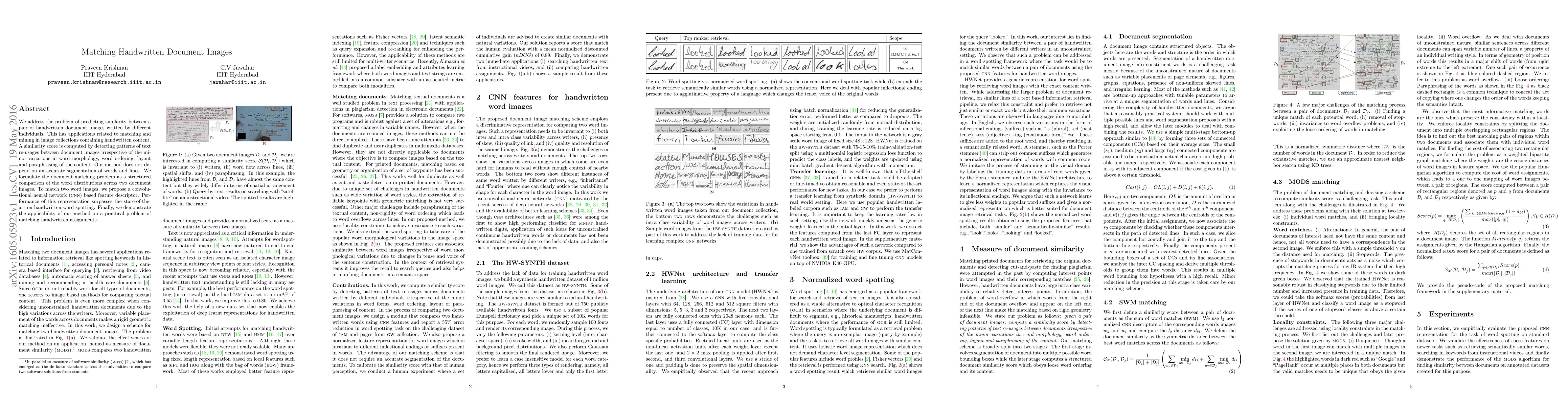 We address the problem of predicting similarity between a pair of handwritten document images written by different individuals. This has applications related to matching and mining in image collections containing handwritten content. A similarity score is computed by detecting patterns of text re-usages between document images irrespective of the minor variations in word morphology, word ordering, layout and paraphrasing of the content. Our method does not depend on an accurate segmentation of words and lines. We formulate the document matching problem as a structured comparison of the word distributions across two document images. To match two word images, we propose a convolutional neural network (CNN) based feature descriptor. Performance of this representation surpasses the state-of-the-art on handwritten word spotting. Finally, we demonstrate the applicability of our method on a practical problem of matching handwritten assignments.