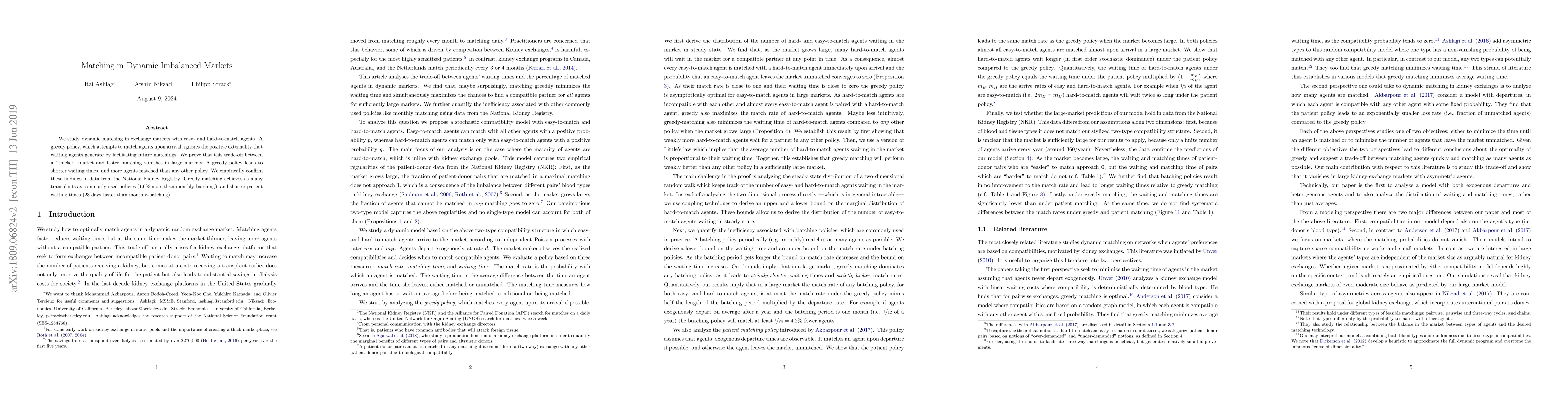 This paper investigates dynamic matching in imbalanced exchange markets, demonstrating that a greedy matching policy, which matches agents upon arrival, outperforms other strategies by reducing waiting times and increasing the number of matches, even in large markets. Empirical data from the National Kidney Registry supports these theoretical findings, showing that greedy matching achieves nearly as many transplants as other methods while significantly shortening patient waiting times.