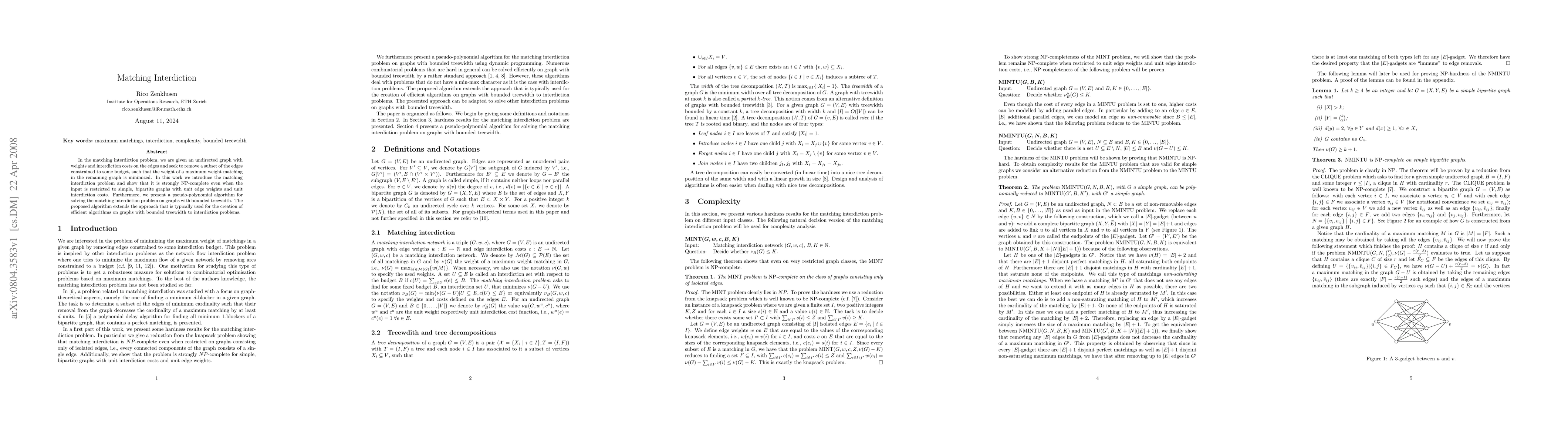 The matching interdiction problem aims to minimize the weight of a maximum matching after removing edges within a budget; it's proven strongly NP-complete even for simple bipartite graphs with unit costs. A pseudo-polynomial algorithm is introduced for solving it on graphs with bounded treewidth.