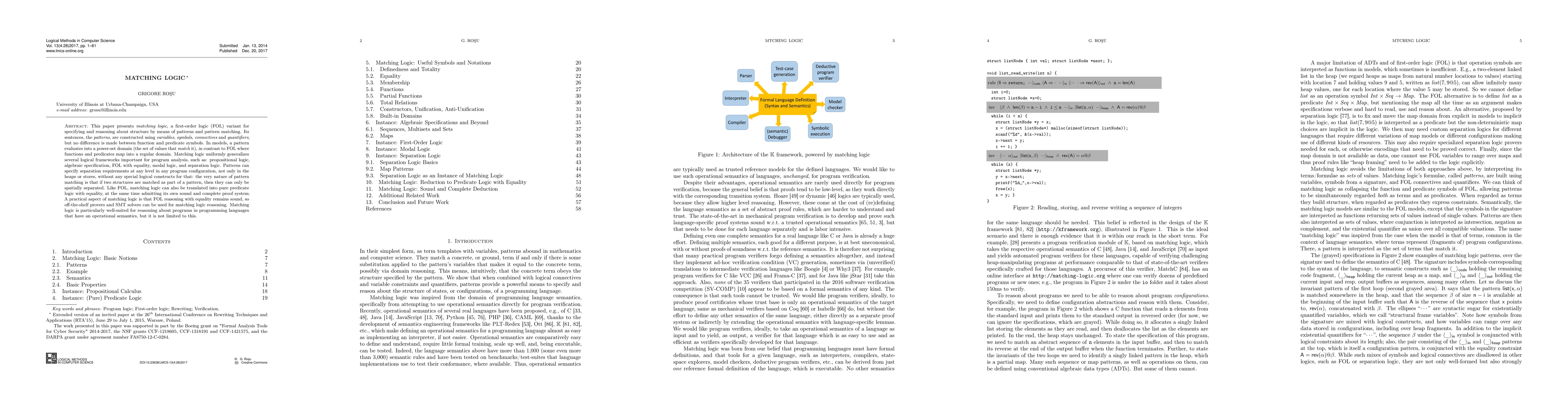 The paper introduces matching logic, a first-order logic variant that uses patterns and pattern matching to specify and reason about structure, generalizing several logical frameworks including propositional logic, algebraic specification, first-order logic with equality, modal logic, and separation logic.