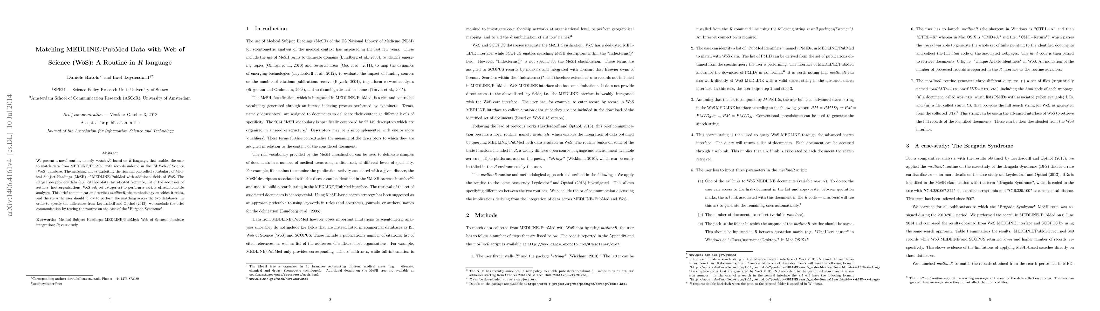 This paper introduces medlineR, an R-based routine for matching MEDLINE/PubMed data with Web of Science (WoS) records, leveraging MeSH vocabulary and additional WoS fields for enhanced scientometric analysis. The routine is tested on the case of "Burgada Syndrome" to demonstrate its effectiveness.