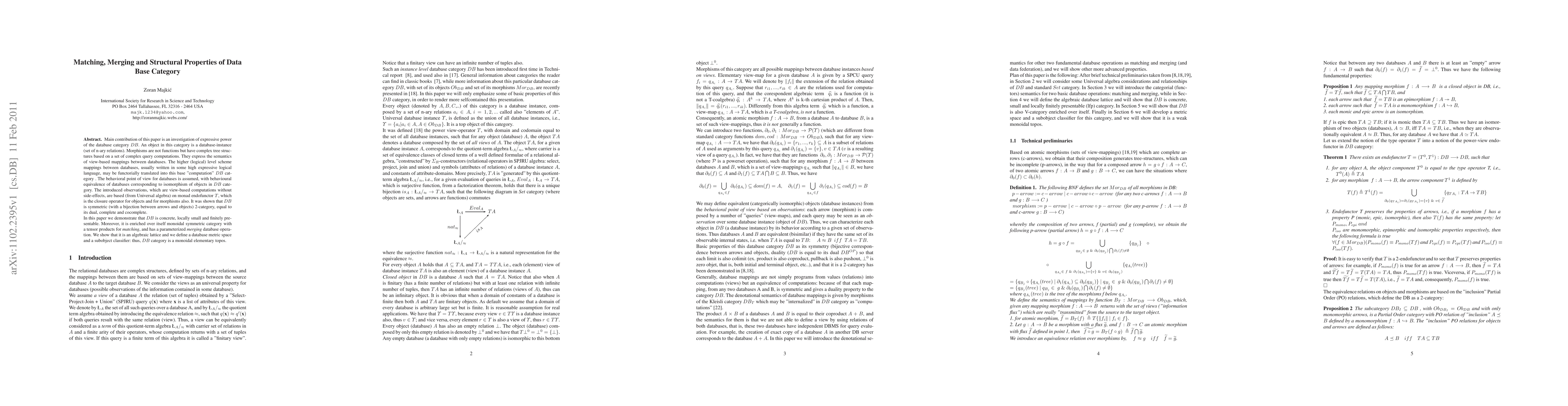 Main contribution of this paper is an investigation of expressive power of the database category DB. An object in this category is a database-instance (set of n-ary relations). Morphisms are not functions but have complex tree structures based on a set of complex query computations. They express the semantics of view-based mappings between databases. The higher (logical) level scheme mappings between databases, usually written in some high expressive logical language, may be functorially translated into this base "computation" DB category . The behavioral point of view for databases is assumed, with behavioural equivalence of databases corresponding to isomorphism of objects in DB category. The introduced observations, which are view-based computations without side-effects, are based (from Universal algebra) on monad endofunctor T, which is the closure operator for objects and for morphisms also. It was shown that DB is symmetric (with a bijection between arrows and objects) 2-category, equal to its dual, complete and cocomplete. In this paper we demonstrate that DB is concrete, locally small and finitely presentable. Moreover, it is enriched over itself monoidal symmetric category with a tensor products for matching, and has a parameterized merging database operation. We show that it is an algebraic lattice and we define a database metric space and a subobject classifier: thus, DB category is a monoidal elementary topos.