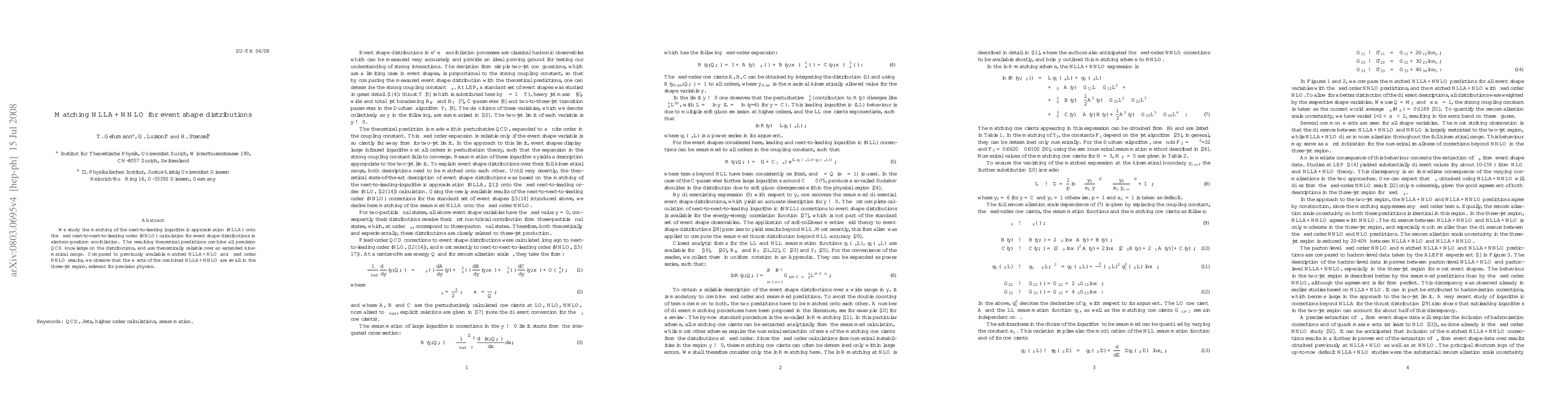 We study the matching of the next-to-leading logarithmic approximation (NLLA) onto the fixed next-to-next-to-leading order (NNLO) calculation for event shape distributions in electron-positron annihilation. The resulting theoretical predictions combine all precision QCD knowledge on the distributions, and are theoretically reliable over an extended kinematical range. Compared to previously available matched NLLA+NLO and fixed order NNLO results, we observe that the effects of the combined NLLA+NNLO are small in the three-jet region, relevant for precision physics.