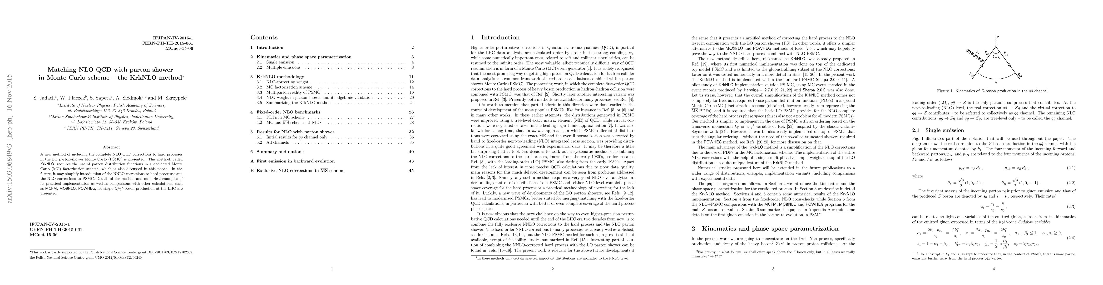 The KrkNLO method introduces a novel approach to incorporate complete next-to-leading order (NLO) Quantum Chromodynamics (QCD) corrections into leading-order (LO) parton-shower Monte Carlo simulations. This method aims to simplify future implementations of higher-order corrections and is demonstrated through practical applications and comparisons with other relevant calculations for single $Z/\gamma^*$-boson production at the LHC.