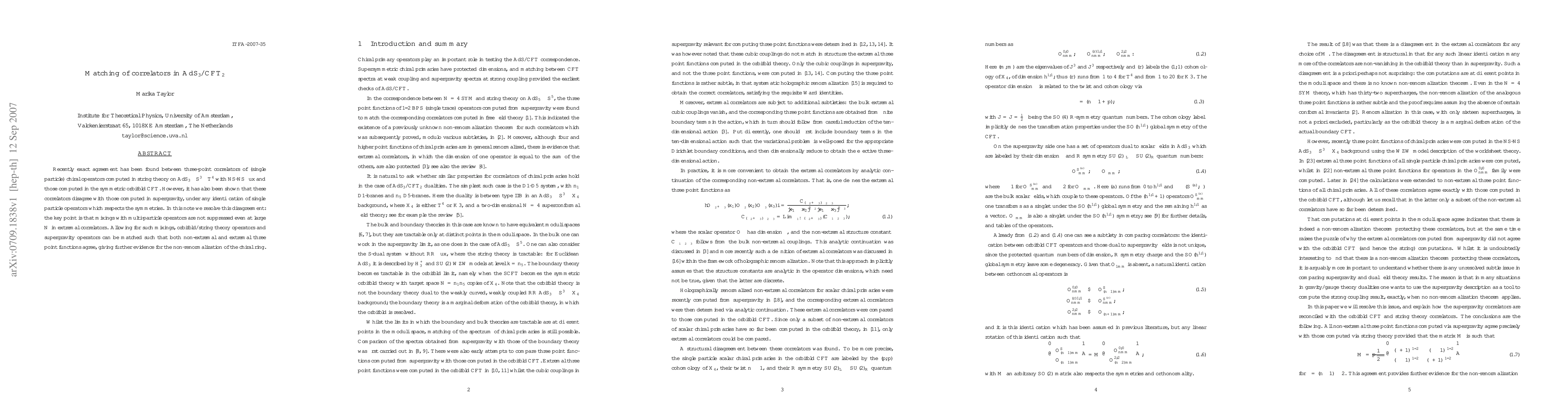 Recently exact agreement has been found between three-point correlators of chiral operators computed in string theory on AdS_3 x S^3 x T^4 with NS-NS flux and those computed in the symmetric orbifold CFT. However, it has also been shown that these correlators disagree with those computed in supergravity, under any identification of single particle operators which respects the symmetries. In this note we resolve this disagreement: the key point is that mixings with multi-particle operators are not suppressed even at large N in extremal correlators. Allowing for such mixings, orbifold/string theory operators and supergravity operators can be matched such that both non-extremal and extremal three point functions agree, giving further evidence for the non-renormalization of the chiral ring.