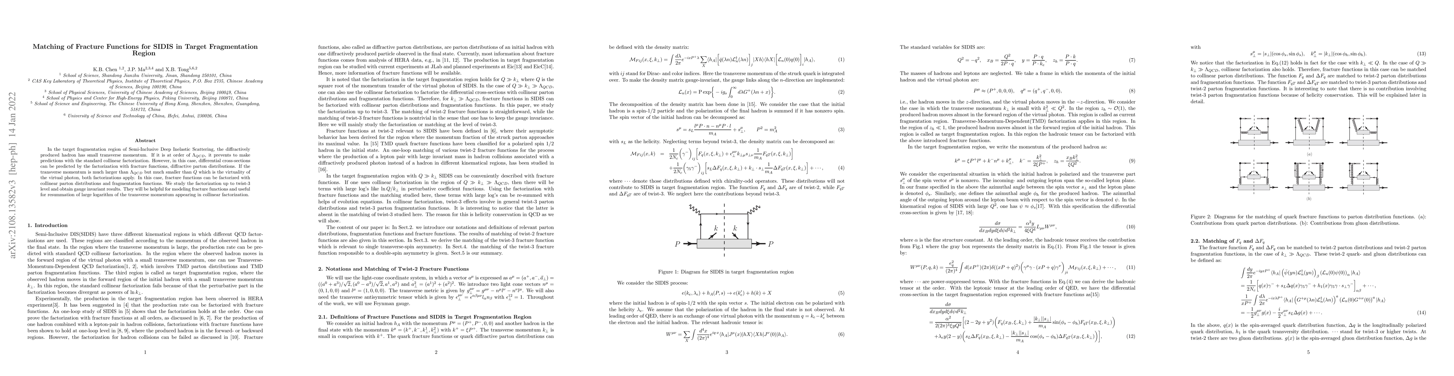 In the target fragmentation region of Semi-Inclusive Deep Inelastic Scattering, the diffractively produced hadron has small transverse momentum. If it is at order of $\Lambda_{QCD}$, it prevents to make predictions with the standard collinear factorization. However, in this case, differential cross-sections can be predicted by the factorization with fracture functions, diffractive parton distributions. If the transverse momentum is much larger than $\Lambda_{QCD}$ but much smaller than $Q$ which is the virtuality of the virtual photon, both factorizations apply. In this case, fracture functions can be factorized with collinear parton distributions and fragmentation functions. We study the factorization up to twist-3 level and obtain gauge invariant results. They will be helpful for modeling fracture functions and useful for resummation of large logarithm of the transverse momentum appearing in collinear factorization.
