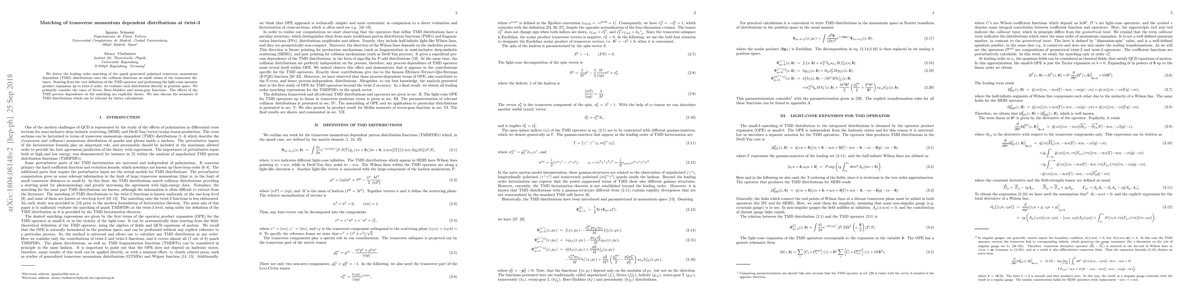 This paper derives the leading order matching of quark-generated polarized transverse momentum dependent (TMD) distributions to collinear functions at small transverse distances, focusing on Sivers, Boer-Mulders, and worm-gear functions. It evaluates the distributions in position space using the light-cone operator product expansion up to twist-3 order, highlighting TMD process dependence and discussing moments relevant for lattice calculations.