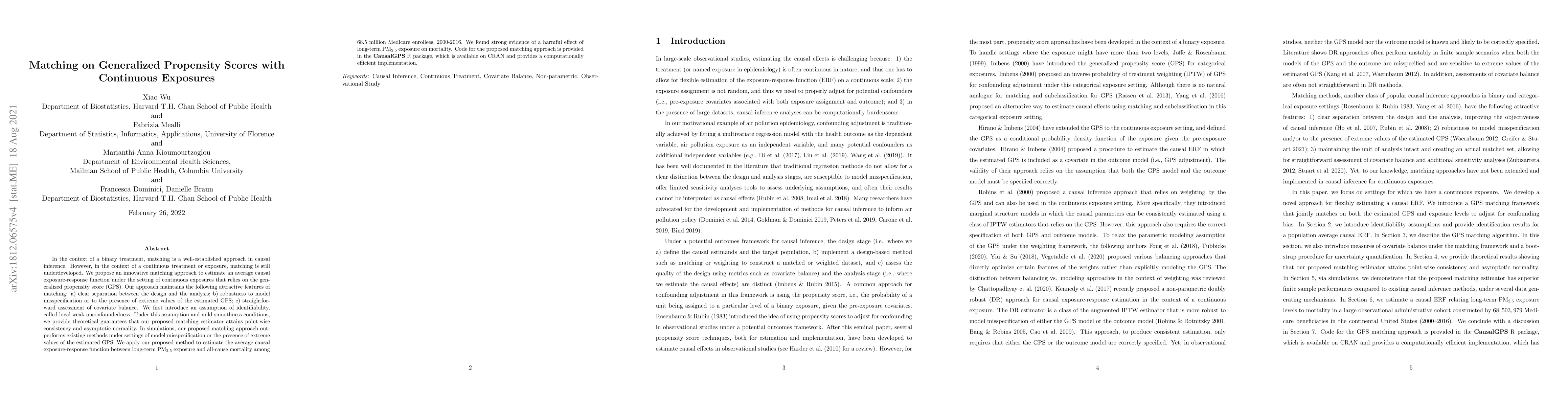 This paper proposes a novel matching approach based on generalized propensity scores to estimate the average causal exposure-response function for continuous treatments. The method demonstrates robustness to model misspecification and extreme values, and provides clear separation between design and analysis. The approach is applied to assess the impact of long-term PM$_{2.5}$ exposure on mortality, revealing a significant harmful effect.