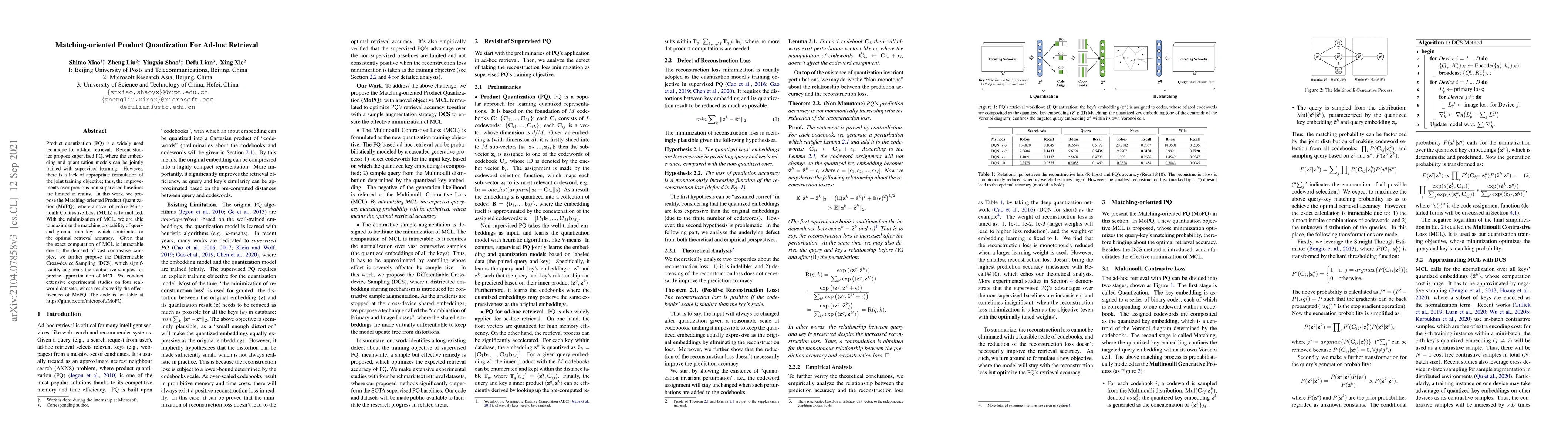 This paper introduces Matching-oriented Product Quantization (MoPQ) with a novel Multinoulli Contrastive Loss (MCL) objective to enhance ad-hoc retrieval accuracy. To approximate MCL's exact computation, the authors propose Differentiable Cross-device Sampling (DCS) and demonstrate MoPQ's effectiveness through experiments on four datasets.