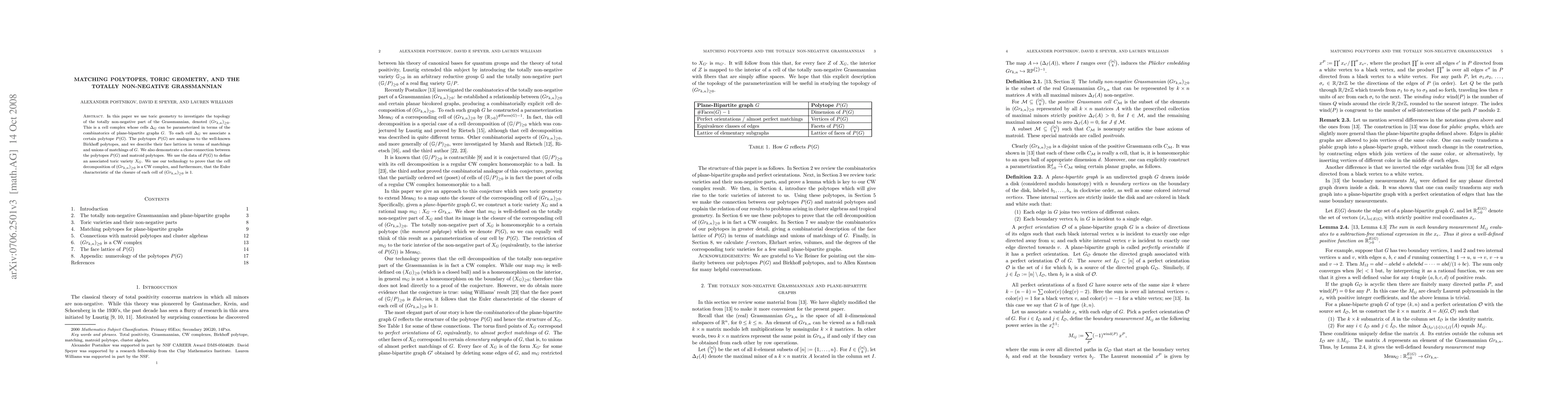 In this paper we use toric geometry to investigate the topology of the totally non-negative part of the Grassmannian (Gr_{kn})_{\geq 0}. This is a cell complex whose cells Delta_G can be parameterized in terms of the combinatorics of plane-bipartite graphs G. To each cell Delta_G we associate a certain polytope P(G). The polytopes P(G) are analogous to the well-known Birkhoff polytopes, and we describe their face lattices in terms of matchings and unions of matchings of G. We also demonstrate a close connection between the polytopes P(G) and matroid polytopes. We then use the data of P(G) to define an associated toric variety X_G. We use our technology to prove that the cell decomposition of (Gr_{kn})_{\geq 0} is a CW complex, and furthermore, that the Euler characteristic of the closure of each cell of (Gr_{kn})_{\geq 0} is 1.