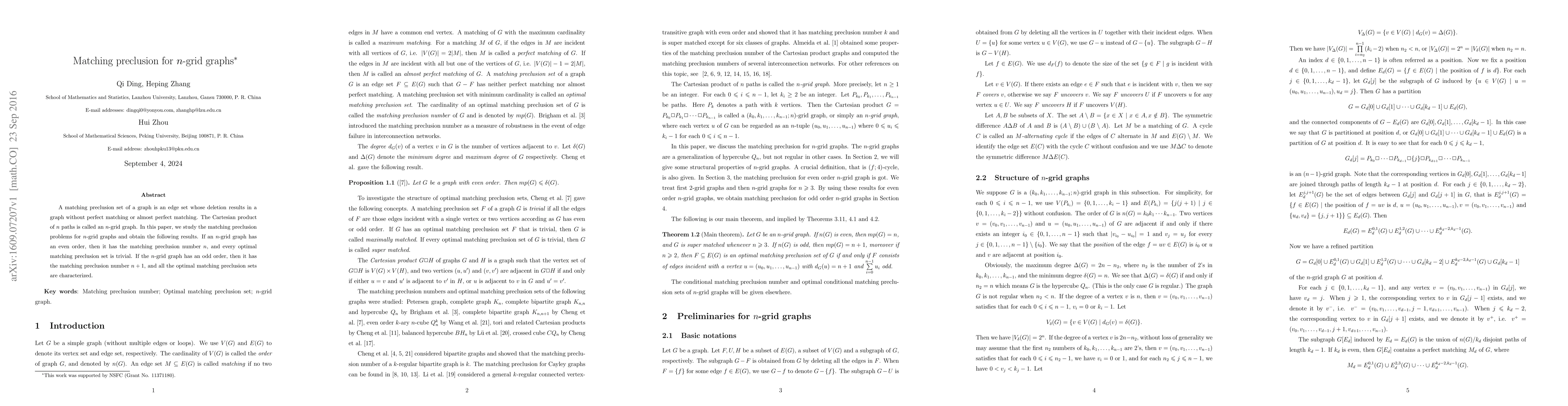 The paper investigates matching preclusion for $n$-grid graphs, determining that even-ordered $n$-grid graphs have a matching preclusion number of $n$ with trivial optimal sets, while odd-ordered $n$-grid graphs have a matching preclusion number of $n+1$ with characterized optimal sets.