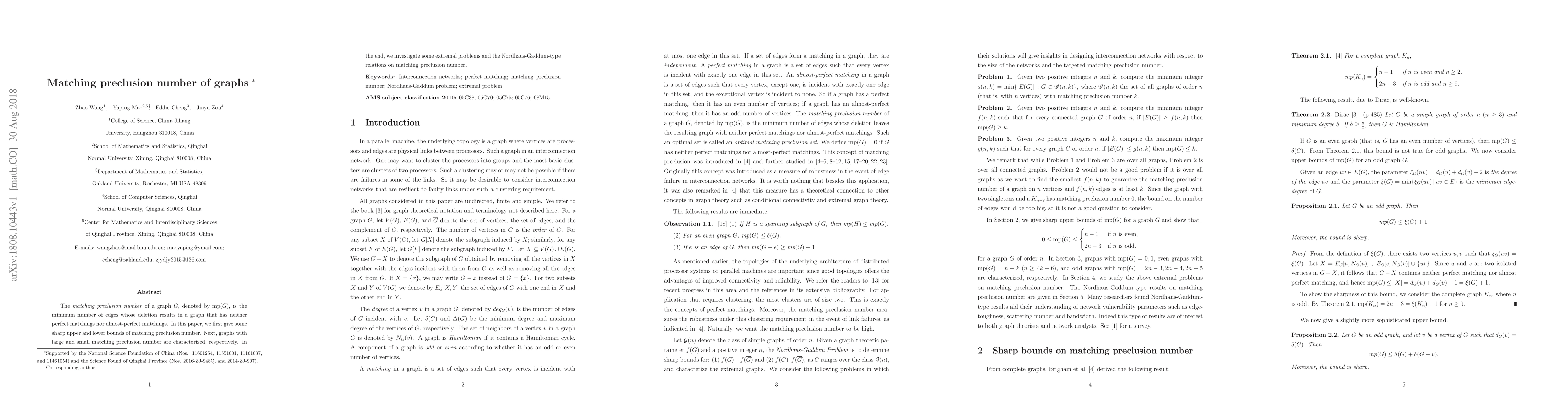 The paper presents detailed characterizations and bounds for the matching preclusion number of graphs, contributing to the theoretical foundation of graph theory and its applications in network design.