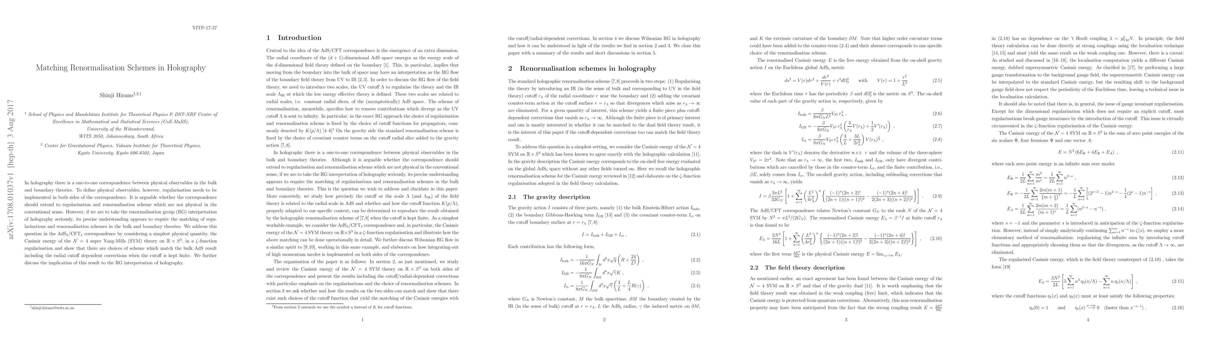 In holography there is a one-to-one correspondence between physical observables in the bulk and boundary theories. To define physical observables, however, regularisation needs to be implemented in both sides of the correspondence. It is arguable whether the correspondence should extend to regularisation and renormalisation scheme which are not physical in the conventional sense. However, if we are to take the renormalisation group (RG) interpretation of holography seriously, its precise understanding appears to require the matching of regularisations and renormalisation schemes in the bulk and boundary theories. We address this question in the AdS_5/CFT_4 correspondence by considering a simplest physical quantity, the Casimir energy of the N=4 super Yang-Mills (SYM) theory on R x S^3, in a {\zeta}-function regularisation and show that there are choices of scheme which match the bulk AdS result including the radial cutoff dependent corrections when the cutoff is kept finite. We further discuss the implication of this result to the RG interpretation of holography.