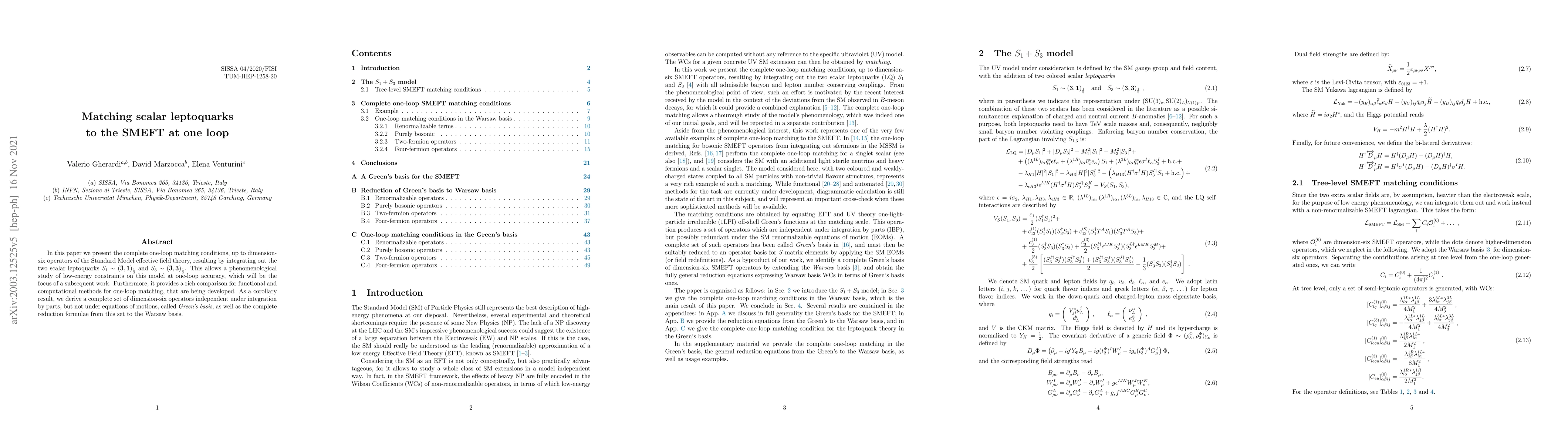 In this paper we present the complete one-loop matching conditions, up to dimension-six operators of the Standard Model effective field theory, resulting by integrating out the two scalar leptoquarks $S_{1}$ and $S_{3}$. This allows a phenomenological study of low-energy constraints on this model at one-loop accuracy, which will be the focus of a subsequent work. Furthermore, it provides a rich comparison for functional and computational methods for one-loop matching, that are being developed. As a corollary result, we derive a complete set of dimension-six operators independent under integration by parts, but not under equations of motions, called Green's basis, as well as the complete reduction formulae from this set to the Warsaw basis.