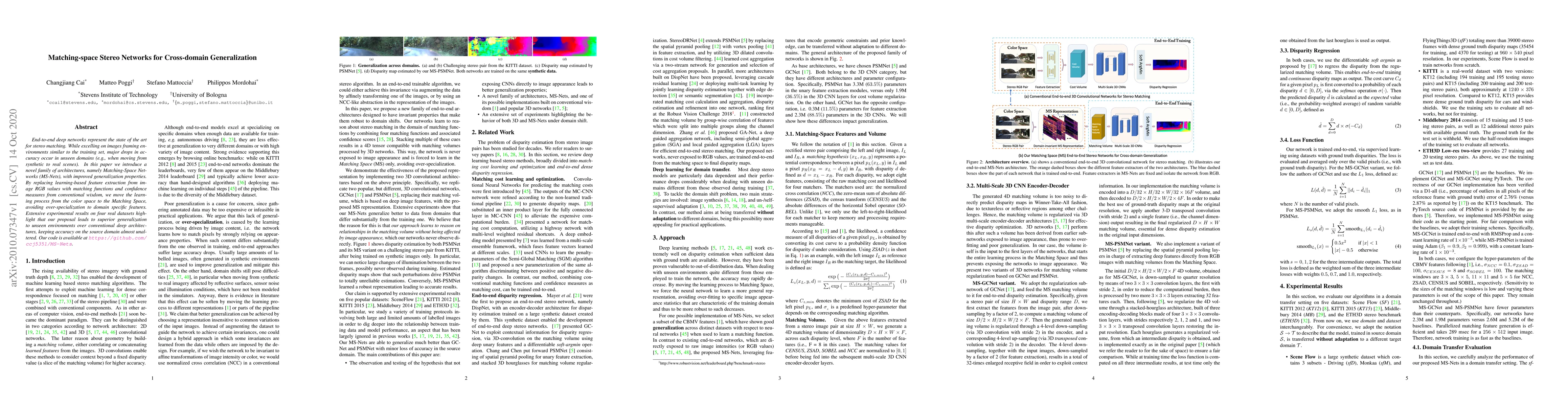 This paper introduces Matching-Space Networks (MS-Nets) to improve cross-domain generalization in stereo matching. By shifting learning from RGB space to Matching Space, MS-Nets avoid over-specialization, leading to better performance on unseen environments while maintaining accuracy on the source domain.