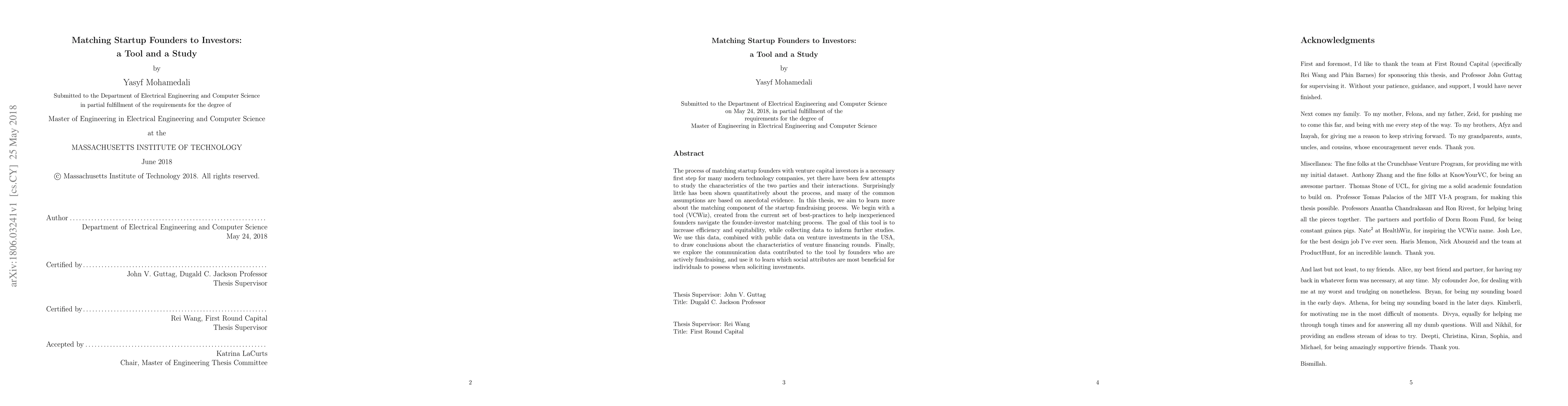The process of matching startup founders with venture capital investors is a necessary first step for many modern technology companies, yet there have been few attempts to study the characteristics of the two parties and their interactions. Surprisingly little has been shown quantitatively about the process, and many of the common assumptions are based on anecdotal evidence. In this thesis, we aim to learn more about the matching component of the startup fundraising process. We begin with a tool (VCWiz), created from the current set of best-practices to help inexperienced founders navigate the founder-investor matching process. The goal of this tool is to increase efficiency and equitability, while collecting data to inform further studies. We use this data, combined with public data on venture investments in the USA, to draw conclusions about the characteristics of venture financing rounds. Finally, we explore the communication data contributed to the tool by founders who are actively fundraising, and use it to learn which social attributes are most beneficial for individuals to possess when soliciting investments.