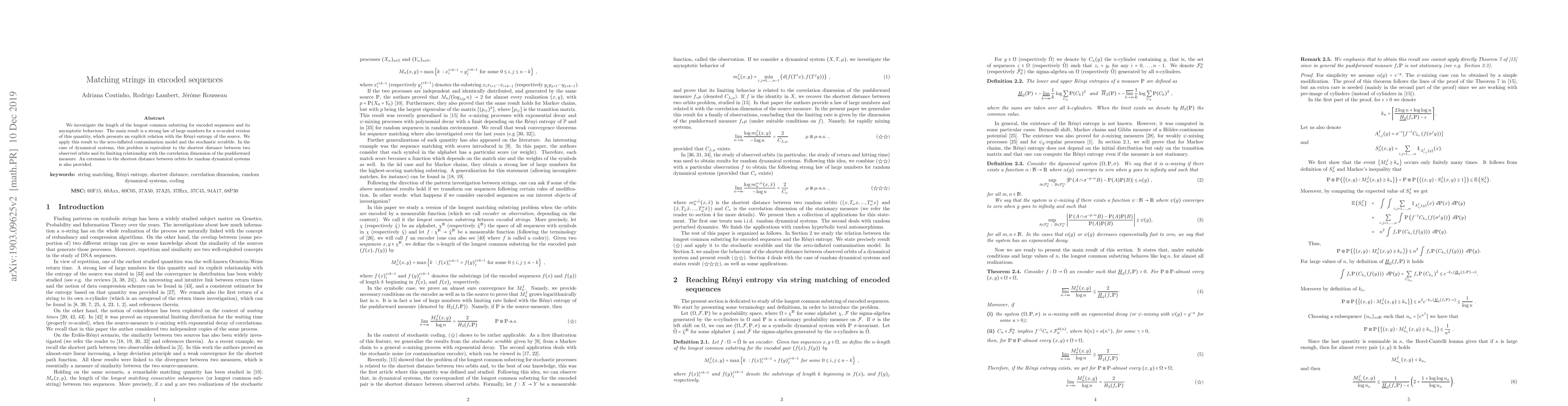 This research paper investigates how to match strings in encoded sequences, finding a strong law of large numbers that relates the matching quantity to Rényi entropy, with implications for dynamical systems and random processes.